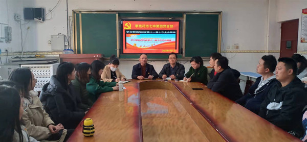 2022年1月7日下午,攀枝花市七中四支部在初中部二楼会议室召开党员扩大会议,徐子耀主持会议,校党委委员、谢子明副校长,四支部党员及部分非党员教师参加会议。谢子明副校长解读中共四川省委十一届十次全会精神。本次全会把深入学习贯彻党的十九届六中全会精神作为重要内容,在深入学习贯彻六中全会精神方面既有重大举措,又有新的特点。
