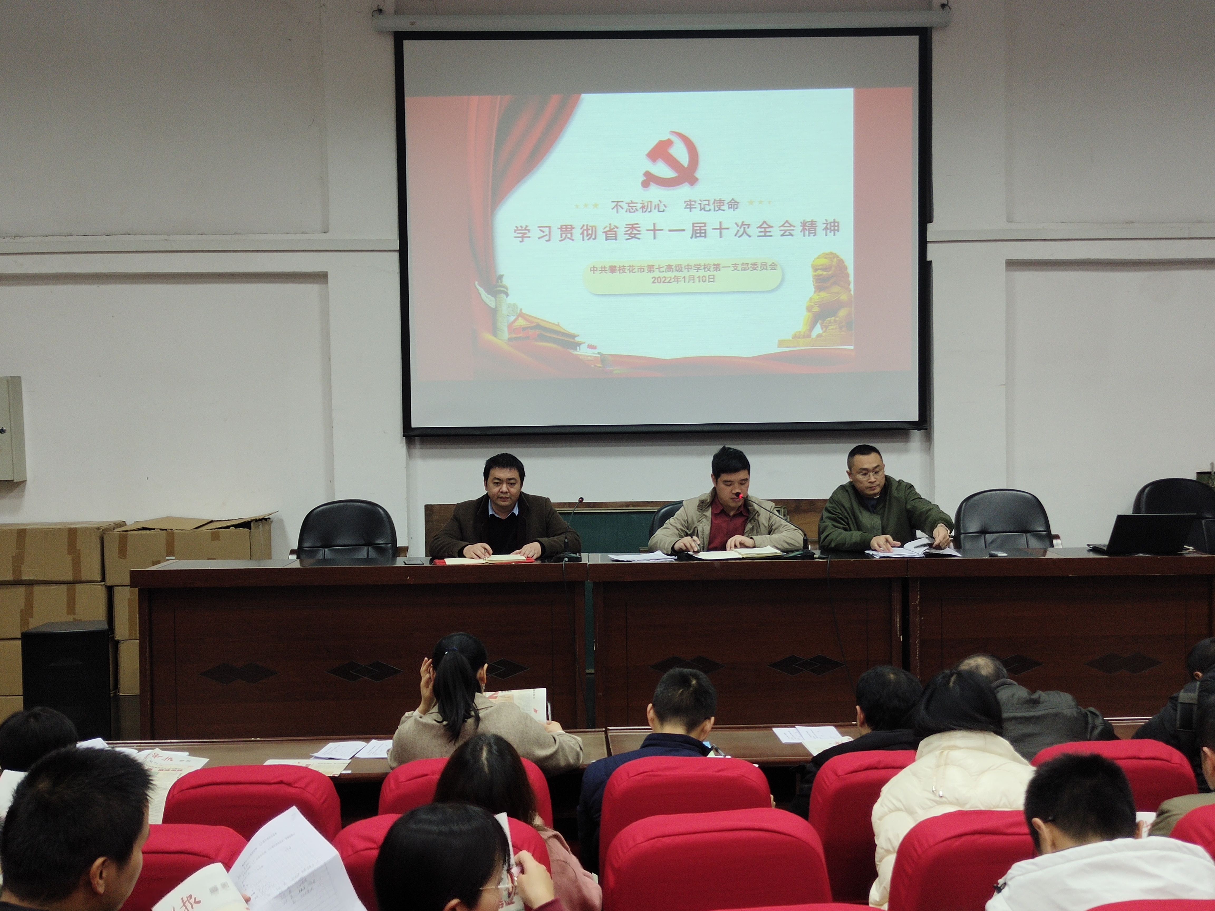 为深入学习宣传贯彻落实省委十一届十次全会精神,持续推进党史学习教育走深走实。2022年1月10日,中共攀枝花七中第一支部委员会在第三报告厅召开专题学习会议,会议由党支部书记牟厚均主持,第一党支部全体党员参加会议。