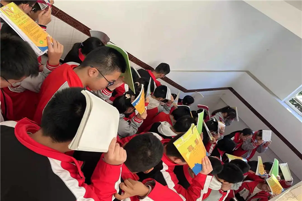 上午9:20,地震预警系统发出警报信号,师生们在教室里就地避险,然后在安全引导员的组织下有序疏散逃生,到达指定安全区域。到达安全的地点后,各级负责人按照班级——教学部——副总指挥层层汇报应到人数、实到人数、安全撤离人数、意外伤害发生情况及应急处置与救治护送情况,整个演练活动有条不紊地开展。