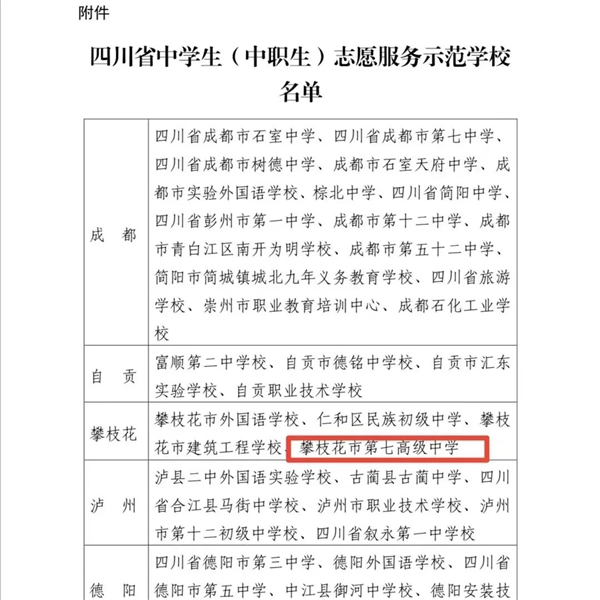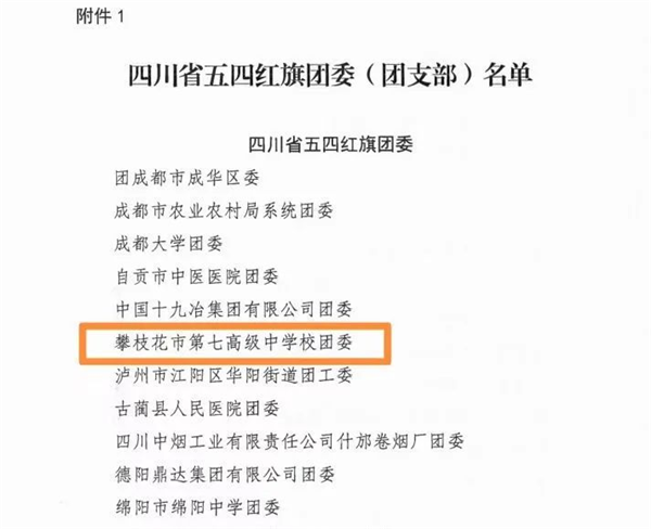 其中,攀枝花市第七高级中学校团委被授予“四川省五四红旗团委”称号。