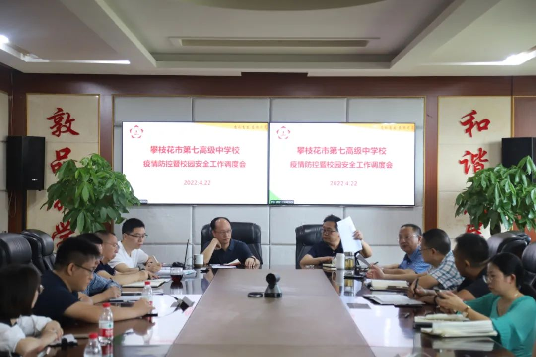 2022年4月22日,市七中在西城校区博通楼四楼多功能会议室召开疫情防控暨校园安全调度会,会议由学校党委书记、校长杨鸿同志主持,学校班子成员及各部门负责人参加会议。