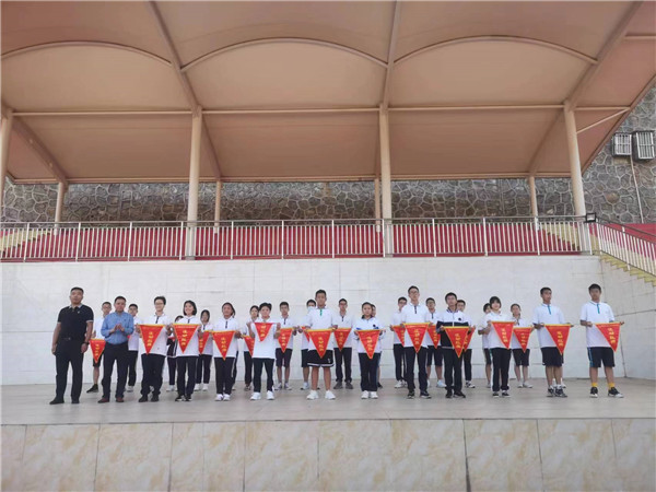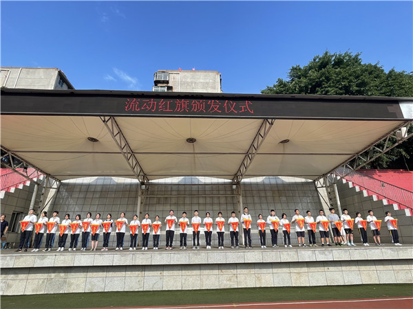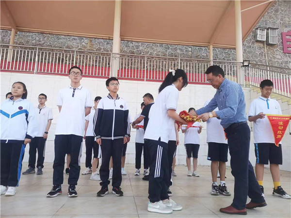 国旗下讲话后,校级领导为文明示范班级和寝室的获得者颁发流动红旗,对上一周学生情况进行了总结表扬。