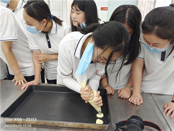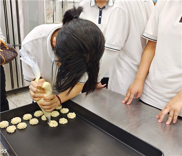 走出中式面点室,同学们来到了西式糕点室,这里的糕点师傅们已经早早为我们准备了美味的曲奇饼干,同学们吃着美味的饼干,也对饼干的制作十分好奇,在师傅们的带领下,他们摇身一变,成了一个个糕点师傅。从奶油的调制,到曲奇饼的成型,同学们听得津津有味。当师傅们把奶油交到同学们手上后,大家一个个弯着腰,拿着奶油,在盘子里挤出了“私人定制”的“曲奇饼”。糕点师傅们对学生的“杰作”给予了高度评价。看着自己的劳动成果得到肯定,同学们心里也美滋滋的。吴俊副校长语重心长地为大家讲解了“冰冻三尺非一日之寒”的道理,并提出在在实践中学习,坚持不懈才会学有所获!
