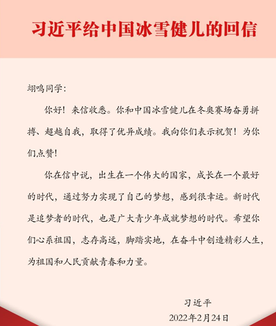 2022年2月24日,习近平总书记专门给中国冰雪健儿代表回信,对冰雪健儿在北京冬奥会取得的优异成绩给予充分肯定,对广大青少年提出殷切期望和明确要求。