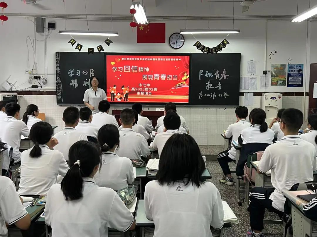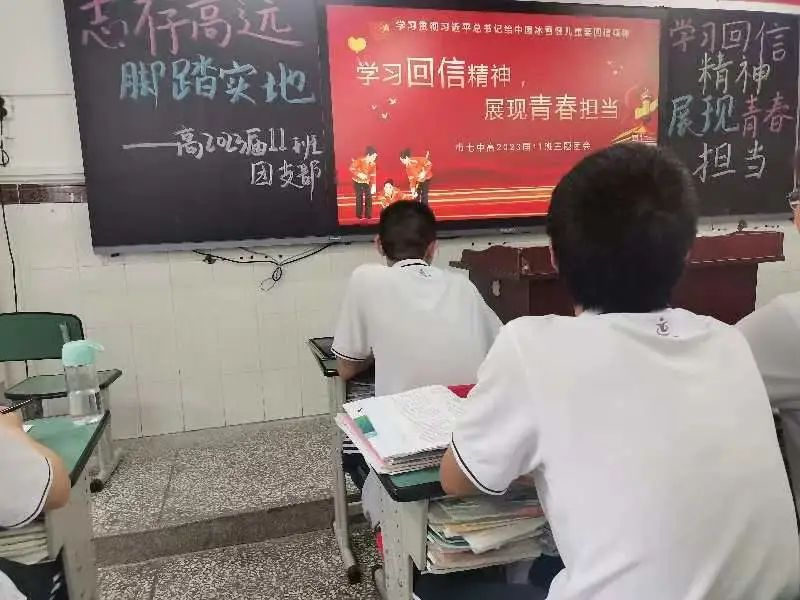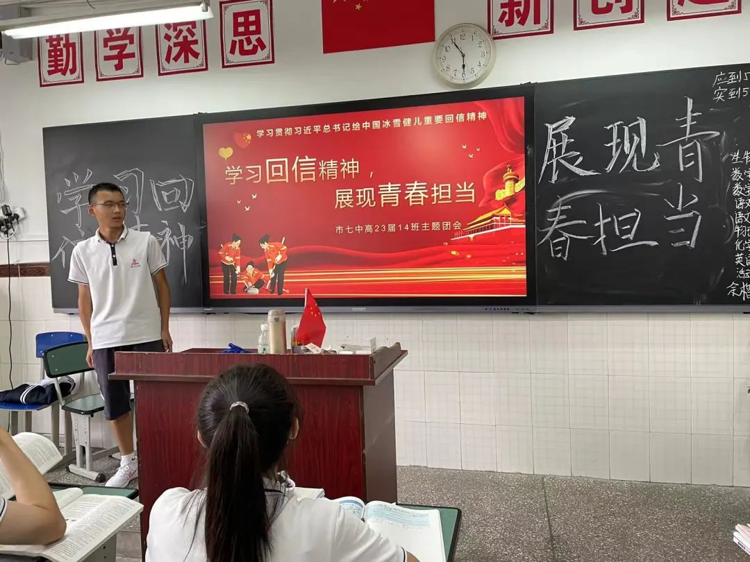 为全面学习贯彻习近平总书记重要回信精神,进一步加强爱国主义教育,推进体教融合发展,引导学生以中国冰雪健儿为榜样,在奋斗中创造精彩人生,2022年5月20日,市七中团委组织各级团组织开展了“学习回信精神,展现青春担当”主题团会。