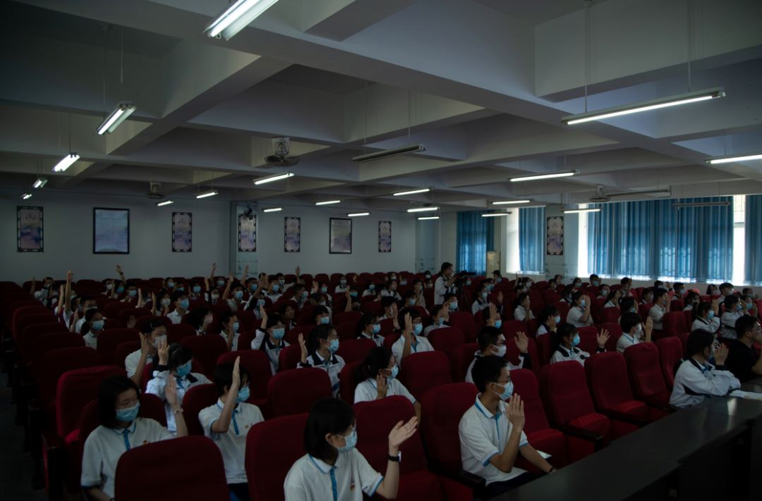 大会举行了隆重的新团员入团宣誓仪式。学校领导、各团总支书记为新团员佩戴团徽、颁发团员证。熠熠团徽昭示着在党的思想光辉照耀下,各族进步青年朝着党所指引的方向奋勇前进。铮铮誓言表达出团员们为实现共产主义事业和中国特色社会主义事业奋斗的信心和决心。