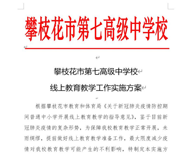 受疫情影响,市七中部分师生所居住的小区实行静态管理。为了有效防控新型冠状病毒肺炎的传播,保障师生健康,同时认真落实攀枝花市教育和体育局《关于加强2022年秋季学期线上教学管理和指导工作的通知》要求,学校党委充分讨论研究,决定在静态管理期间,开展线上线下同步教育教学活动,根据实际,各年级“一班一案”,全面组织在校师生和居家师生有序开展学习和锻炼,实现 “静默不沉默,停课不停学”,要求全体师生共筑安全防线,坚守教育阵地。