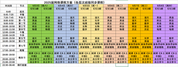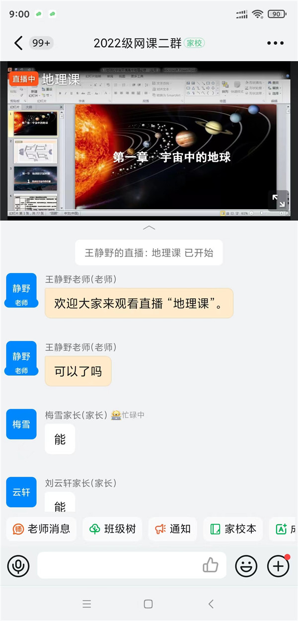 学校各教学部每天对居家隔离和静态管理区域的师生作动态跟踪,依据人数变化及时更新各班级、各直播群的人数,便于班主任和年级及时掌握师生情况。各教学部都建立了网上直播群,将无法返校的市内外学生进行编组,专门安排了备课组长、骨干教师、青年教学能手等优秀教师担任网课教师,制定网课课表,有序开展网上教学。各年级、各班主任也在群里考勤,督促学生入群学习。