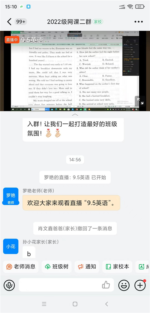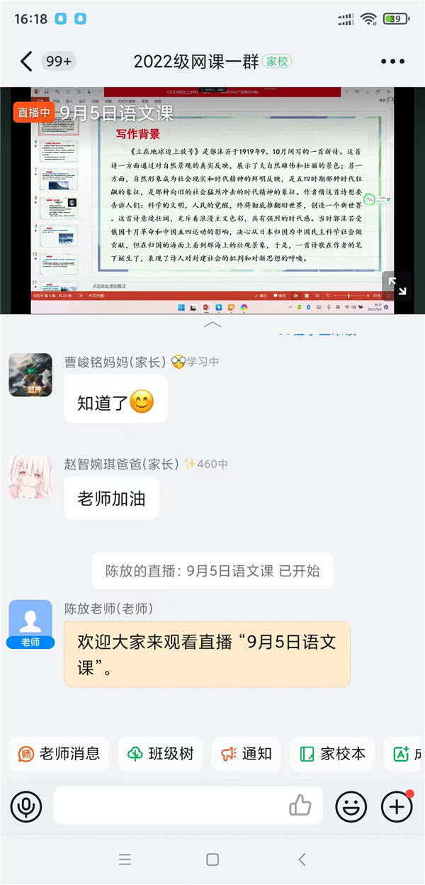 从校长到老师,一听说自己居住的校区实行静态管理,只进不出,便匆匆安排了家中之事,选择留守校园,和学生在一起,坚守教育教学阵地。哪些班级、哪些老师无法上课,在校的老师们都主动站出来:“我可以代课,安排吧。”同组老师守望相助,班主任更是几乎随时跟班。有部分学科确实人手不够,居家管控的老师便开启直播模式,与学生云端相聚。虽然屏幕相隔,但依然可以双向互动。