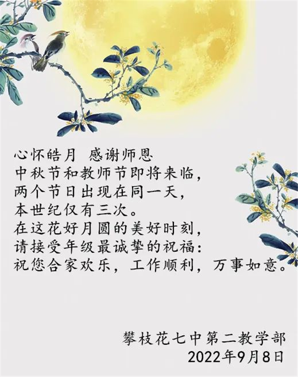 百年大计,教育为本。教育大计,教师为本。”为深入贯彻落实习近平总书记关于教育的重要论述和全国教育大会精神,热烈庆祝第38个教师节,倡导全社会尊师重教,大力弘扬优秀尊师文化,引导学生感念师恩、礼敬教师,努力营造浓厚的节日氛围,我校第二教学部在疫情期间组织开展“心怀皓月,感谢师恩”的主题活动。