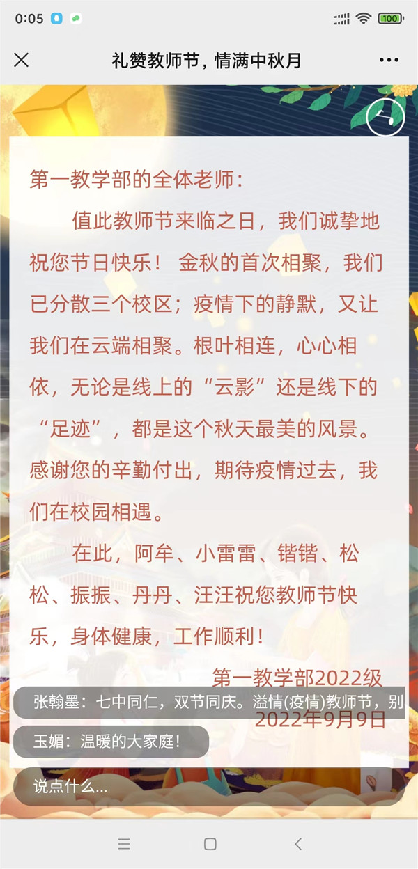更加认真地备课,更加热情地讲解,更加耐心地辅导,疫情下的校园因师生的坚守而更加多情。还在封控区管理的老师也准时出现在电脑前,云端上课,线上教学,依然坚守在教学一线。大课间陪着学生做室内操,体育课和学生一起奔跑,核酸检测组织学生有序排队,应急演练指挥学生快速逃生……从课上到课下,从校级领导到班主任,正如陪伴学生的每一天那样,坚守在工作岗位上。这个教师节,我们幸福而充实。
