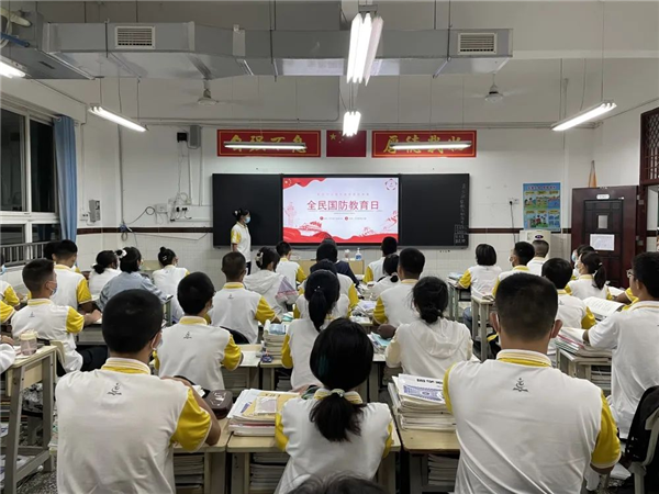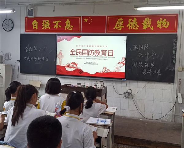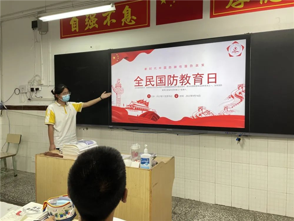 班会课上,各班班主任紧密联系当今世界发展的形势,从国防概述、国防的意义和重要性、我国的国防建设成就等方面,通过生动的图文、视频资料对学生进行讲解,激励学生为建设强大国防实现中华民族伟大复兴的中国梦而不懈奋斗。课上,老师还带领学生们回顾了“九一八事变”的始末,这一段令所有中华儿女义愤填膺的历史,值得我们每一个人铭记在心,学生表示:要重视国防,加强国防,只有强大的国防才能维护祖国的繁荣。主题班会发挥了课堂主渠道作用,有意识的向学生渗透国防知识,把知识传授与国防教育有机结合起来。同时,学校还利用LED屏滚动播放国防教育宣传语,积极营造学习国防知识的浓厚氛围。学校开展的系列活动,进一步增强了学生的国防观念,提高了国防的意识,激发了学生爱国拥军的热情。