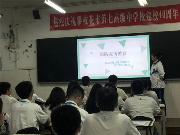 国防是国家安全的保障,青少年是国家的未来和希望。为加强对青年学生的国防教育宣传,增强青年学生的国防观念,培养青年学生的忧患意识和爱国情操,在第22个全民国防教育日来临之际,市七中组织开展以“喜迎党的二十大 共筑中华强国梦”为主题的全民国防教育日主题班会活动。