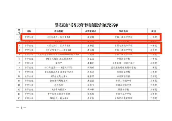 为落实立德树人根本任务、全面提高学生的综合素养、营造全民爱经典的社会氛围,市七中积极响应并组织学生参与攀枝花市教育和体育局、市语言文字工作协会开展的“书香天府”经典阅读活动。学生认真准备,老师悉心指导,市七中三位同学在活动中取得优异成绩!