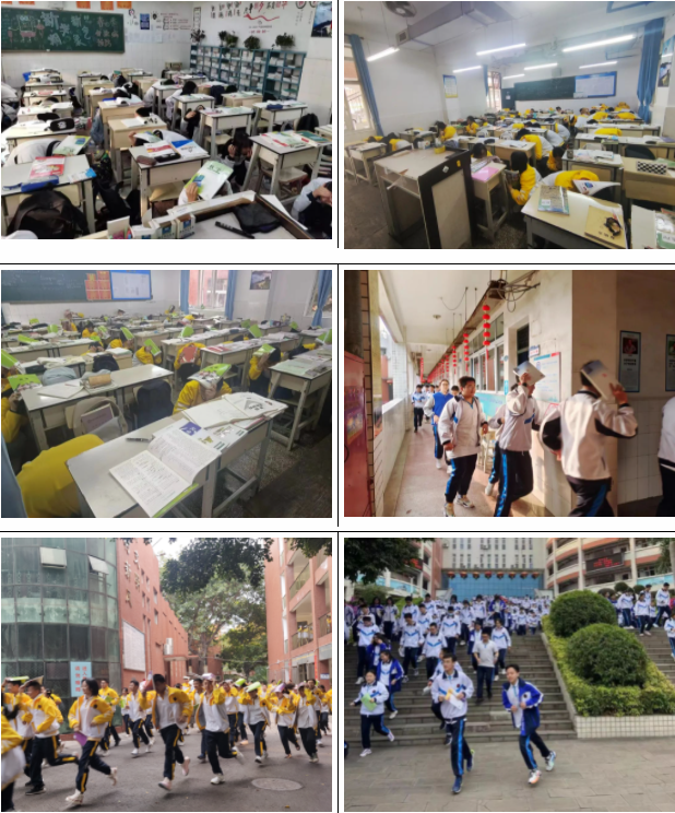 早上9点20分,随着警报声响起,上课教师立即停止教学活动,师生们第一时间躲避到室内墙角或者课桌之间相对安全的地方,警报声过后,全体师生按照规定疏散路线,迅速、有序地离开教室,撤离到学校操场的安全地带,并清点报告撤离人数。