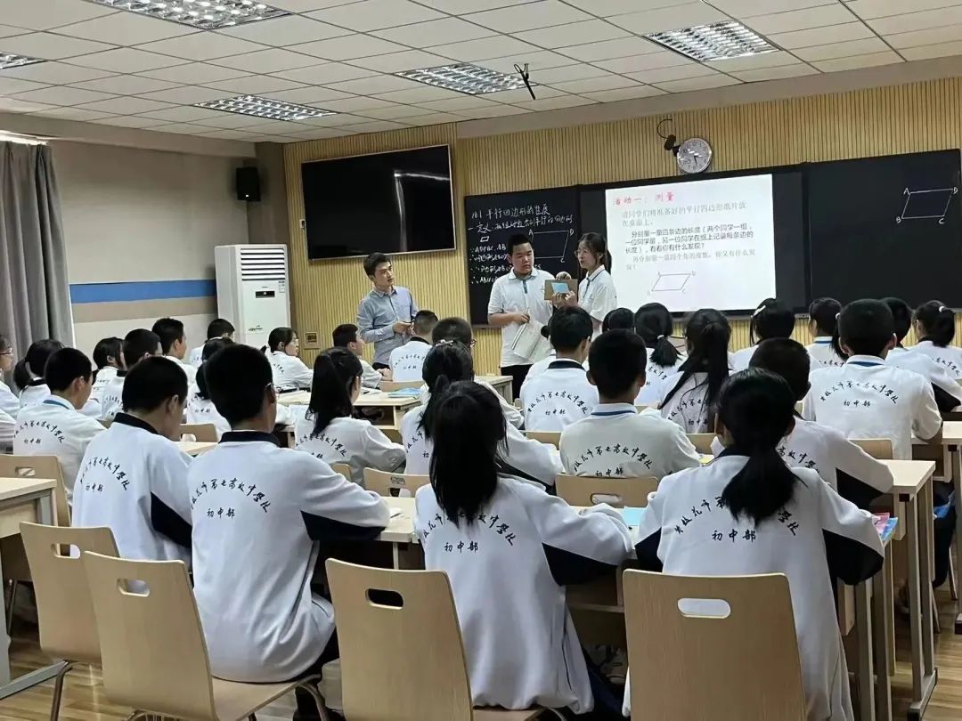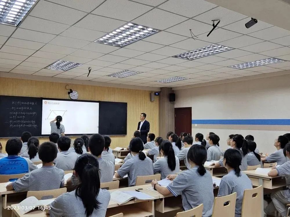 活动内容第一个环节是同课异构《18.1 平行四边形的性质》。市七中王其彬老师、市外国语学校李建模老师分别展示了精彩的示范课。
