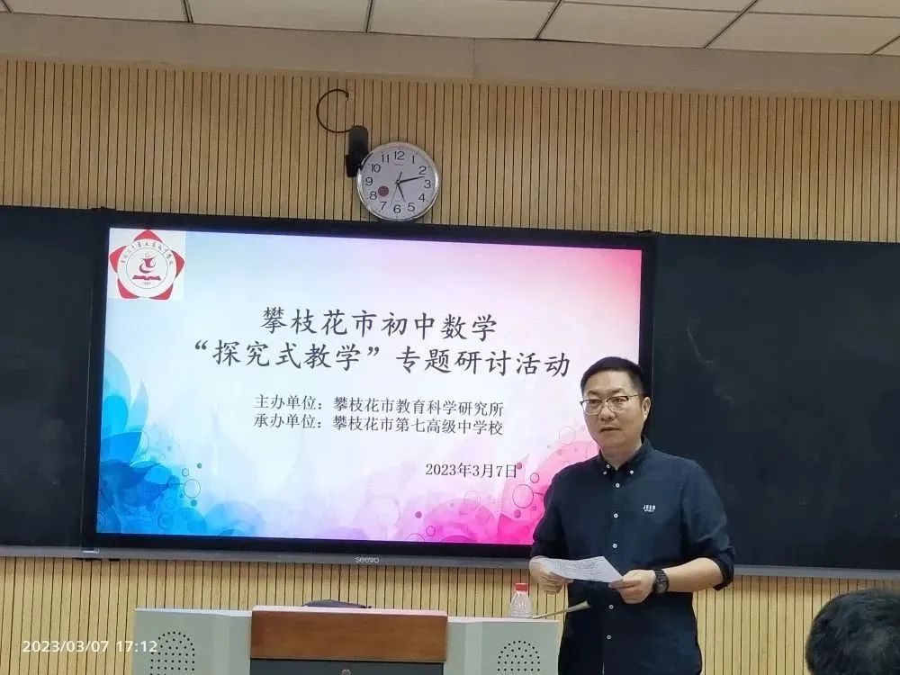 为发展学生数学核心素养,引领课程改革和育人方式变革,提升数学课堂教学质量,2023年3月7日下午,在攀枝花市七中花城校区录播教室举办了全市初中数学“探究式教学”专题研讨活动。攀枝花市教育科学研究所初中数学教研员刘志刚老师、各区县初中数学教研员、各学校数学教研组长和部分优秀数学教师参加了本次活动。