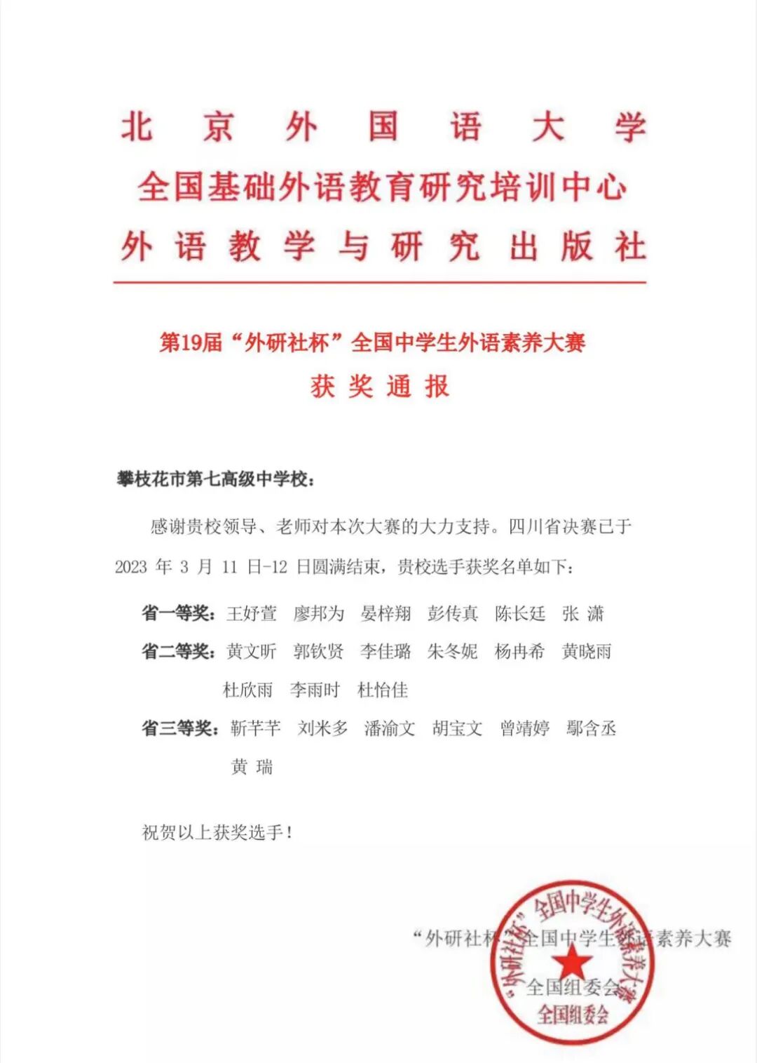 喜报!市七中在第19届“外研社杯”全国中学生外语素养大赛中取得佳绩