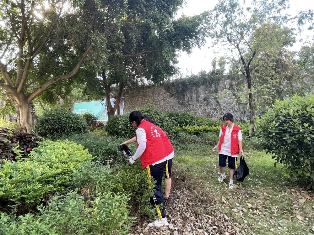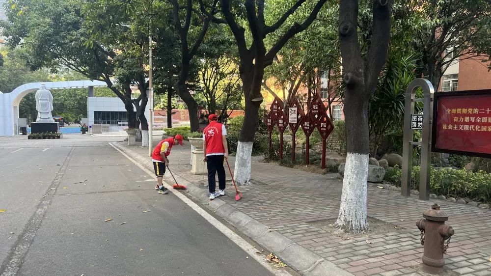 活动中,志愿者们携带扫把、铁夹、撮箕、抹布等劳动工具,捡拾绿化带中的纸张、塑料袋,擦拭宣传橱窗、栏杆,对校外道路、公共场所进行清扫。忙碌的身影奔走在校内外,大家分工协作、干劲十足。