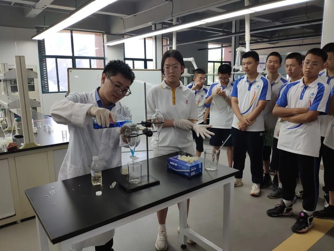 在钒技术研究所,团支部书记高雷章向同学们现场演示了利用化学方法对钒进行提纯、氧化还原和萃取的实验。实验原理及方法与同学们当前学习的化学知识紧密相关,不同价态的钒溶液呈现出五彩斑斓的颜色,让同学们兴趣盎然,惊叹连连,忍不住亲自动手,体验实验过程。