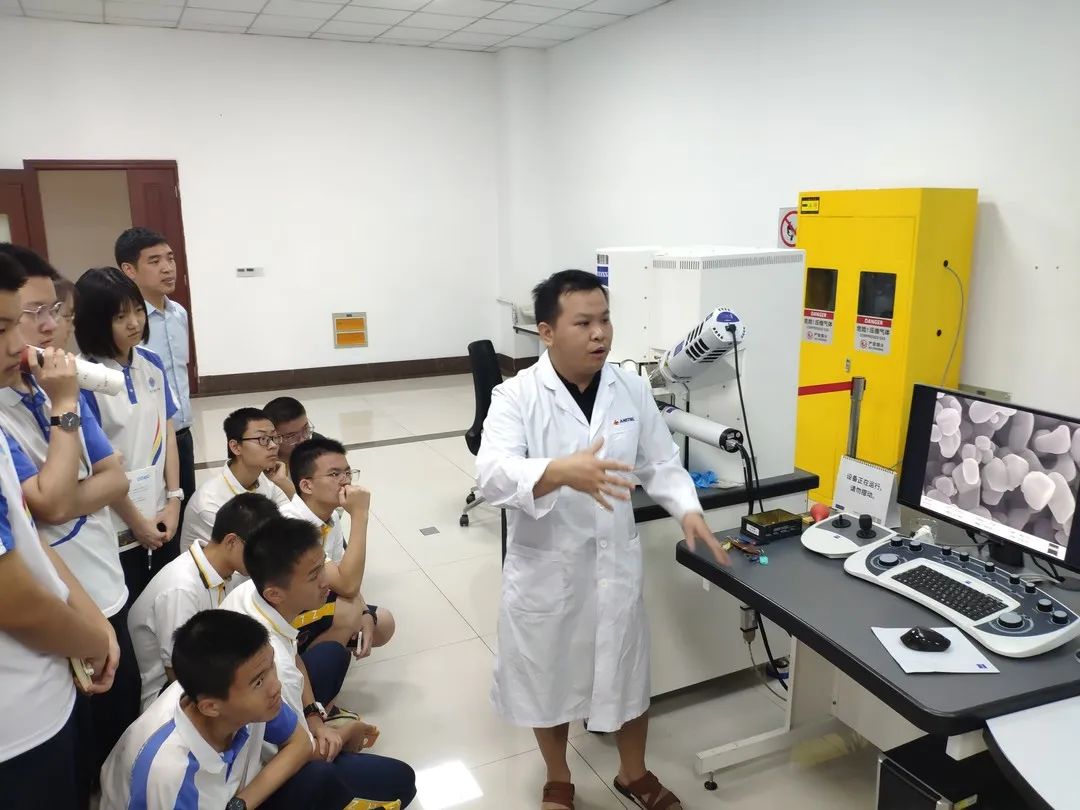 此外,同学们还参观了分析测试中心,体验了能放大50万倍的扫描电镜镜头下令人叹为观止的微观世界。研究员张达富告诉同学们,像这样高尖端的电子显微镜设备目前还只能依赖进口,一台售价高达数百万元,并勉励同学们努力学好科学文化知识,为推进核心技术知识产权自主化贡献力量。