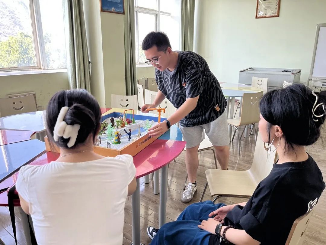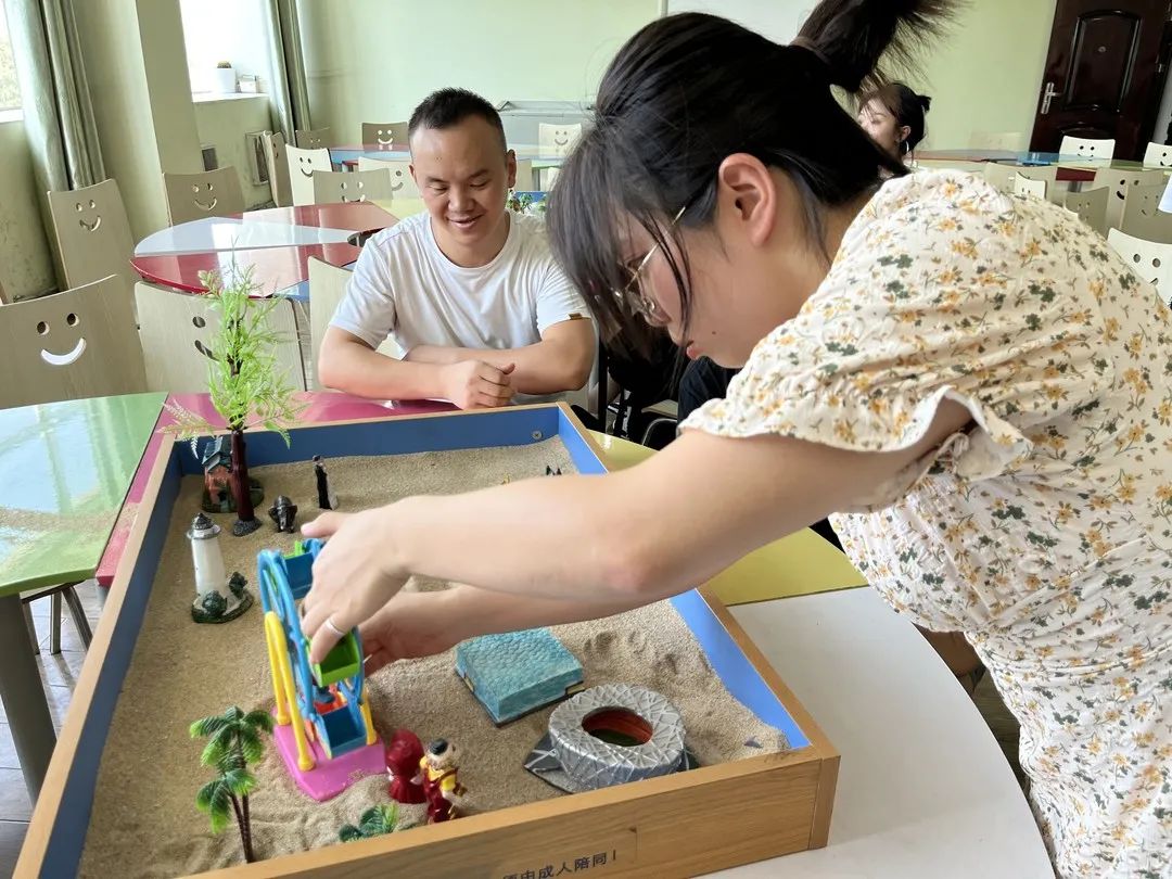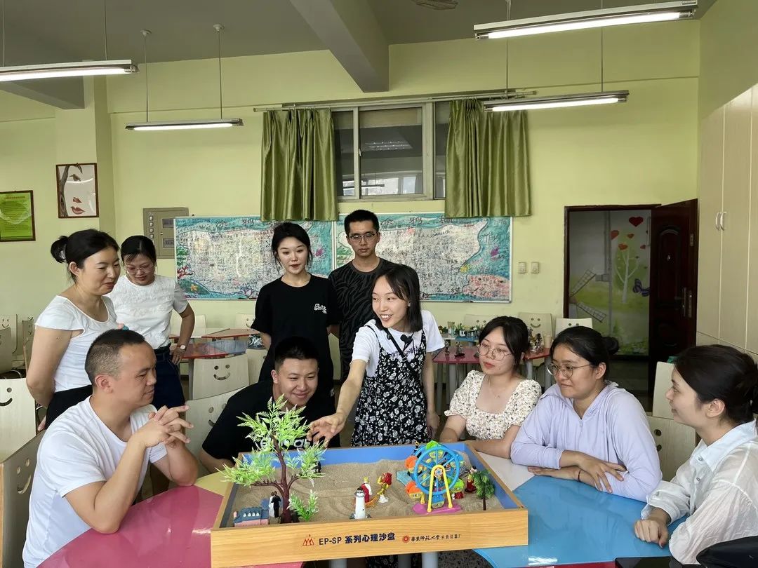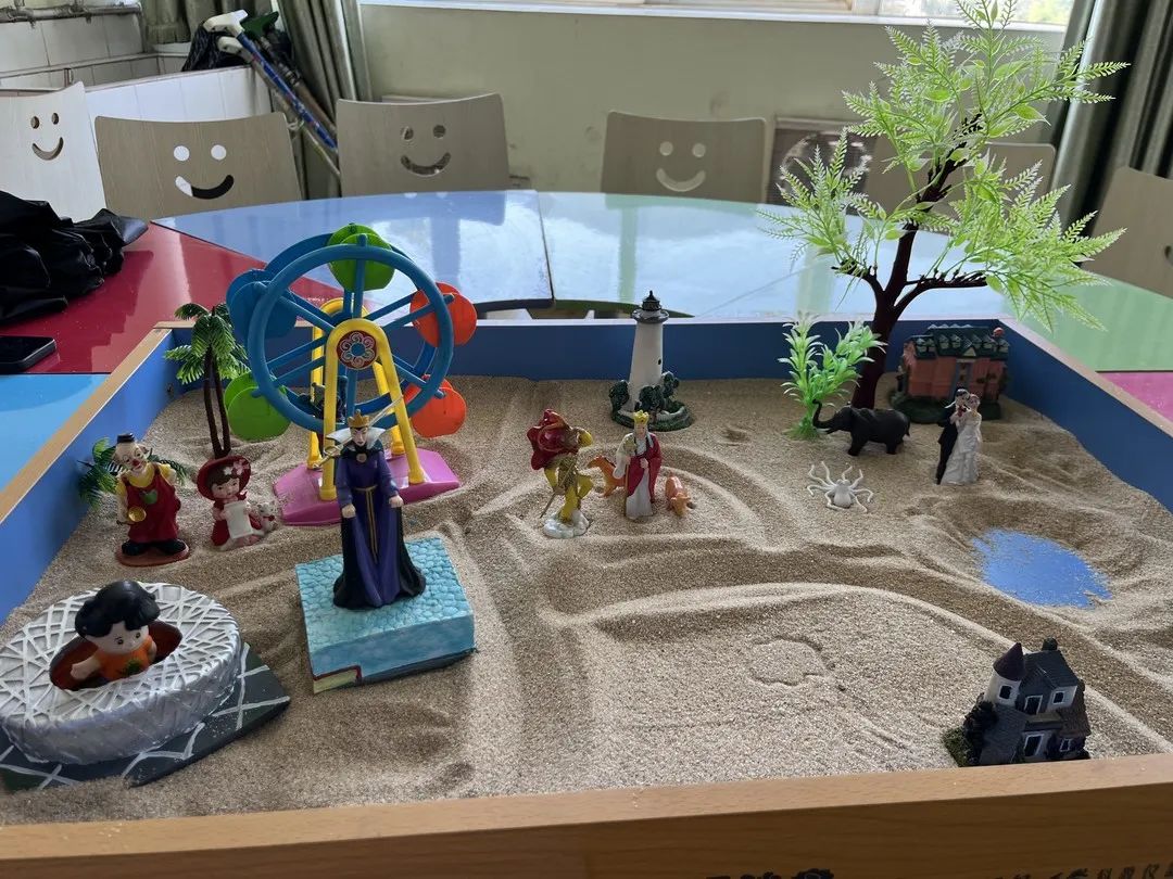 活动中,学校心理老师向虹钰将老师们分为两个组,组织大家玩起了心理沙盘游戏。一盘细沙,一架子各式各样的物件,经由老师们的自由创造,构建起了一个具有探索意义的沙盘世界,向老师的解说与引导,也让青年教师们更加认识了自己,掌握了舒缓情绪、释放压力的办法,整个活动在轻松愉悦的氛围中进行。