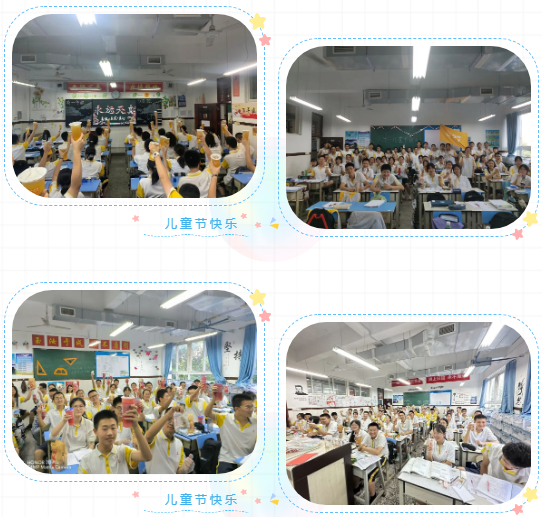 在各班主任的精心策划和家长的全力支持下,各班儿童节活动丰富多彩,每一份礼物都饱含着对同学们的关爱,为他们庆祝专属的节日。教室里一时间热闹非凡,有的班级举办美食分享会,在吃吃喝喝中分享快乐;有的班级玩起了各种童年游戏,让大家重温童年;有的班级许下愿望,放飞梦想;同时不忘将这份快乐分享给老师们,邀请老师到班级参加活动,亦或把自己的小零食放到老师办公桌上。随处可见同学们灿烂的笑脸,儿童节,该是这样肆意与烂漫。在激情四溢的活动中,他们用欢笑与热情向童年挥手,褪去稚气,却又不忘童真,迎来青春,迎来成长。
