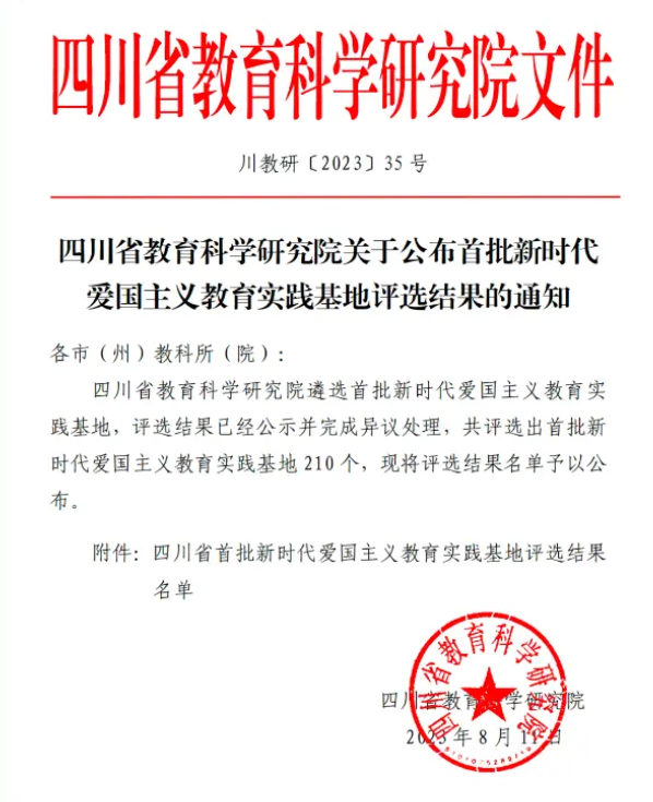本次评选全省共有492个单位申报,省教科院组织专家组依据评选标准,遵照客观、公平、公正原则,在前期各市(州)教科所(院)和有关单位推荐申报的单位中,评选出首批新时代爱国主义教育实践基地210个。