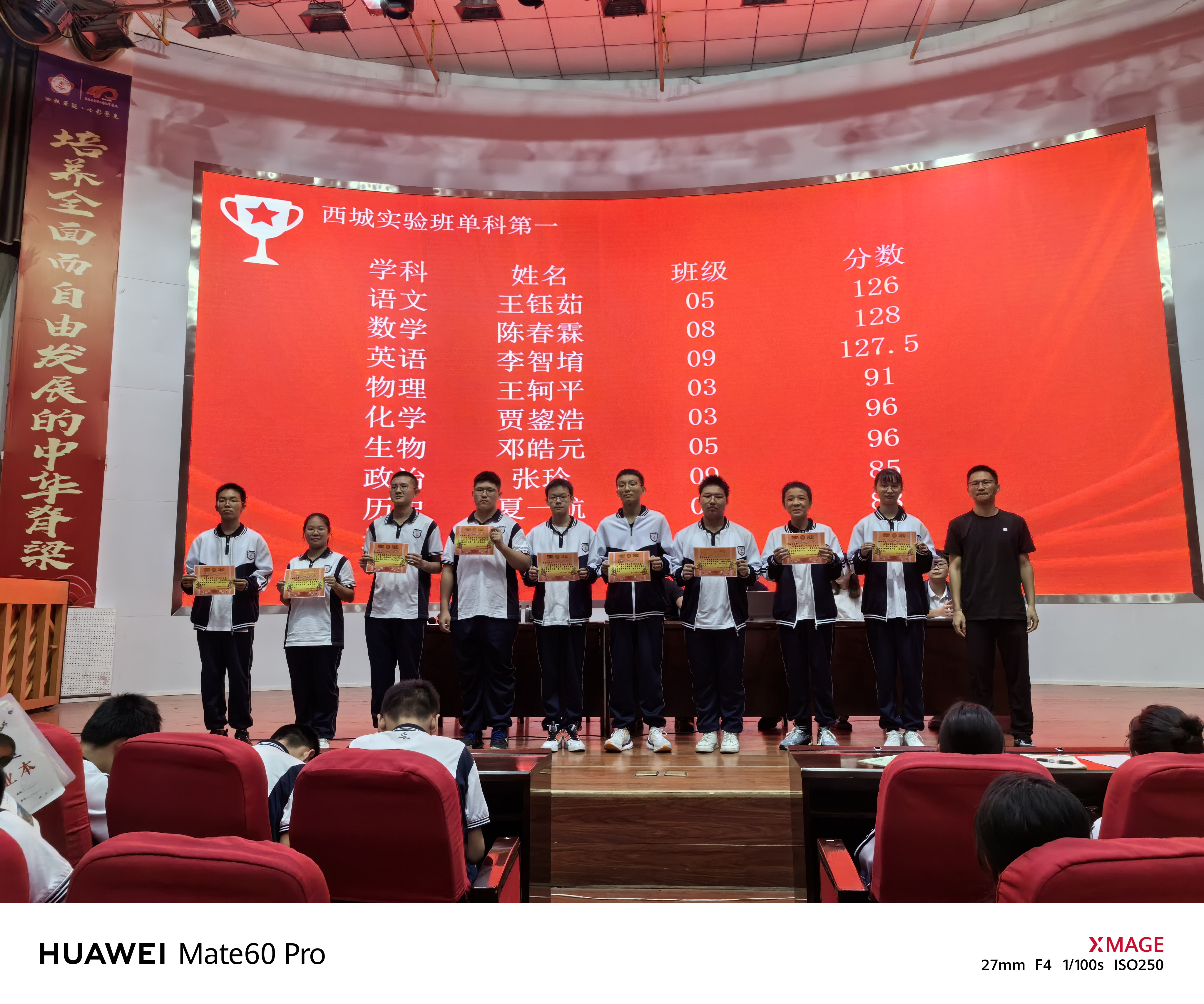 西城校区由分管副校长赵均勇、年级管理团队为获得优秀班级荣誉的学生代表颁奖。继而优秀学生代表胡耀娟经验分享:要调整好自己的学习态度和休息时间、要多看书、要整理反思错题、要掌握考试技巧。