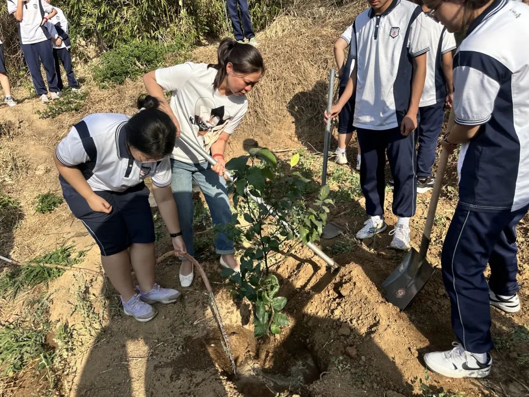 下午5时许,在郭老师和余老师的带领下,同学们到达植树现场。经过两位老师及校园环卫师傅的讲解和指导后,同学们迫不及待的开始植树行动。