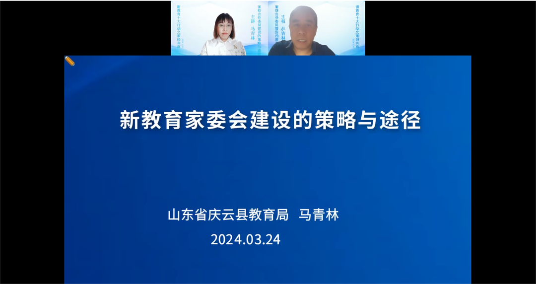 2024年3月24日晚,新网师家校合作共育项目行动研究迎来了第二期《新教育家委会建设的策略与途径》研讨活动,我校德育和艺体科科长李丽娟在会上分享了我校关于家委会的建设情况,从宗旨、组织结构、成员遴选、制度建设等方面介绍了我校为保证家委会工作顺利开展的具体做法,也通过家委会开展的一系列工作:积极开展助教助学活动、参与学校管理和监督、参与民主评议、沟通协调等,展现了我校家委会用积极的行动和无限的热情用心用情为孩子助力,用智用力为学校分忧。