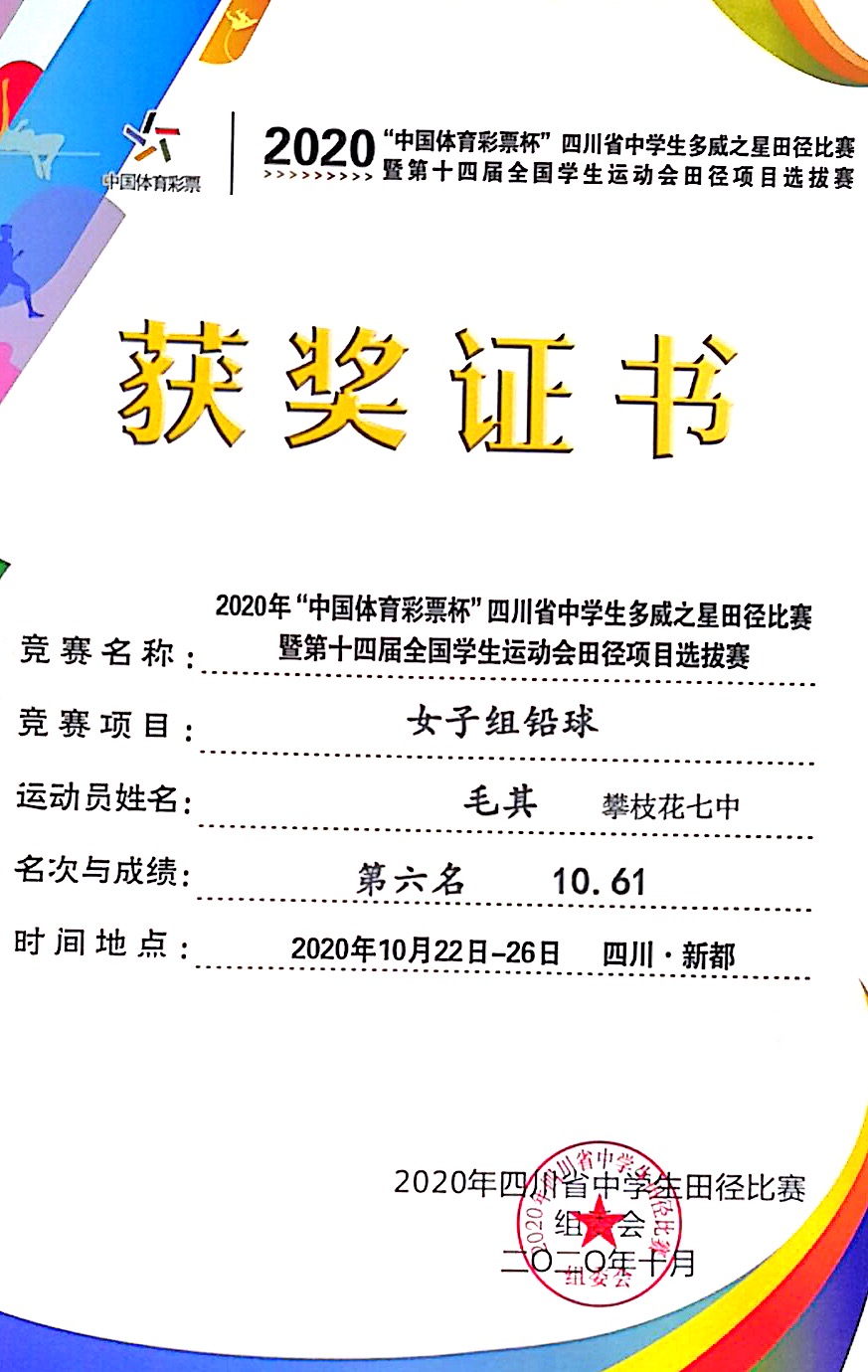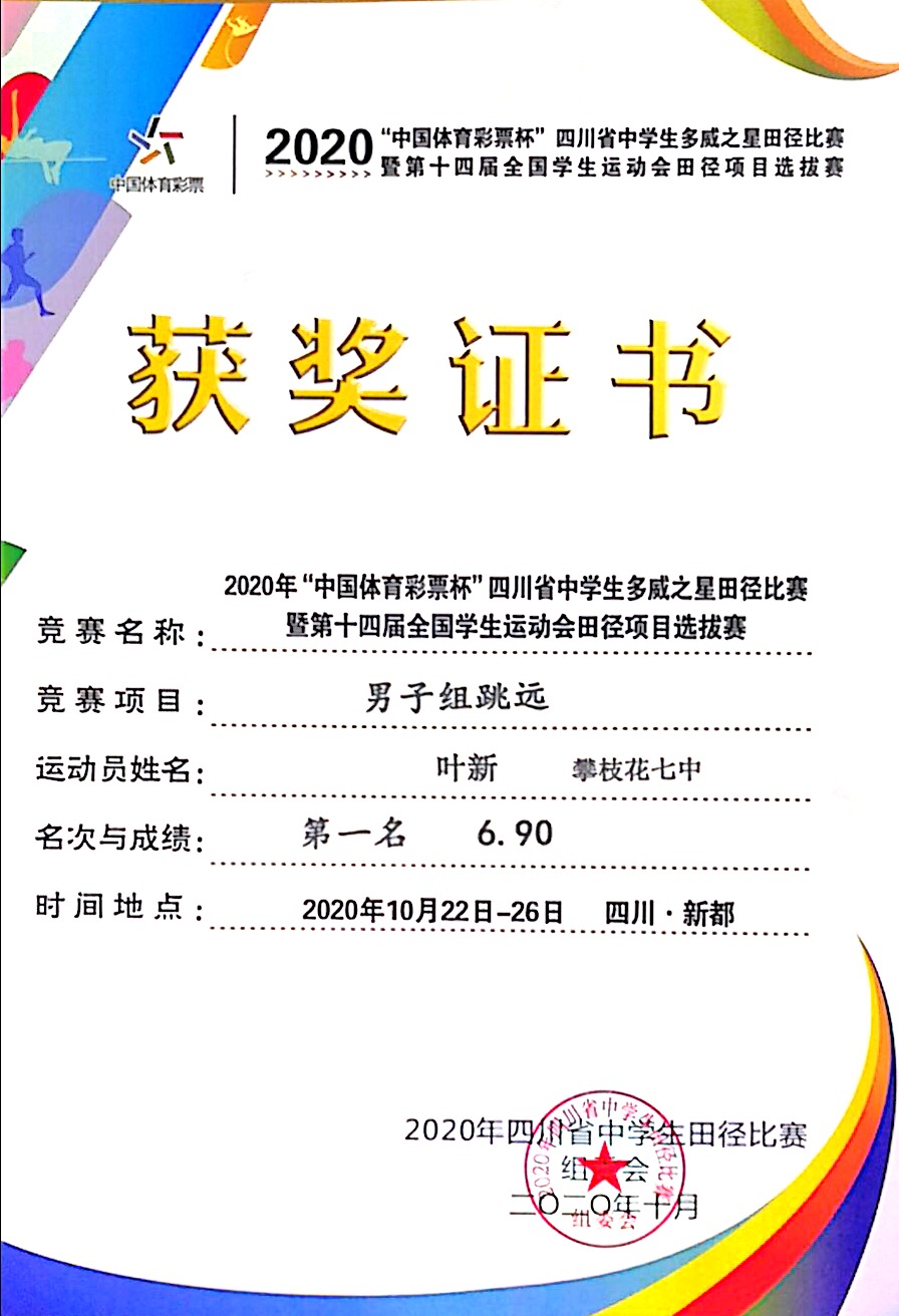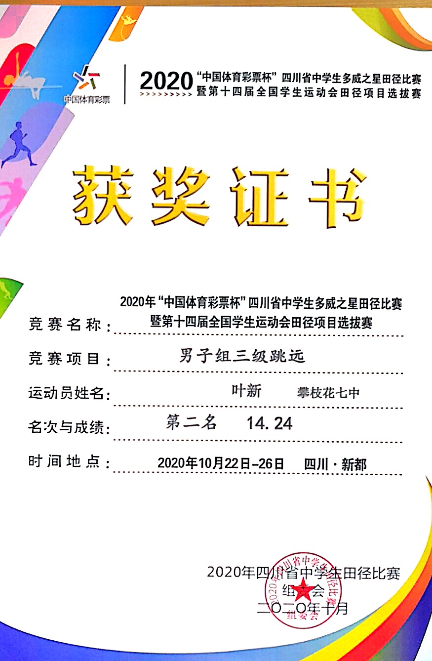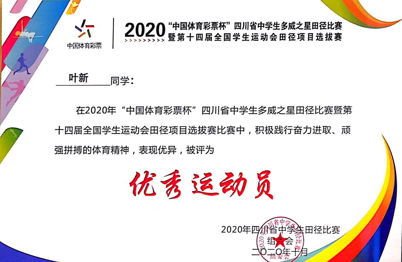 2020年10月24日至26日我校12名运动员参加在成都市新都一中举行的四川省中学生田径比赛,全省84所中学参与激烈争夺。我校学生叶新获男子组跳远第一名(6.90米)三级跳远第二名(14.24米)并获优秀运动员奖。李康荣获男子组铅球第七名(11.17米),毛其获女子组铅球第六名(10.61米)。我校获体育道德风尚奖。