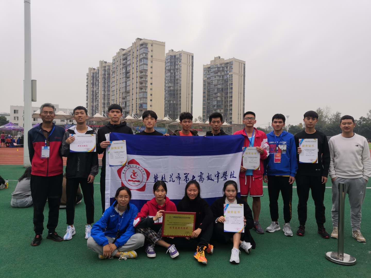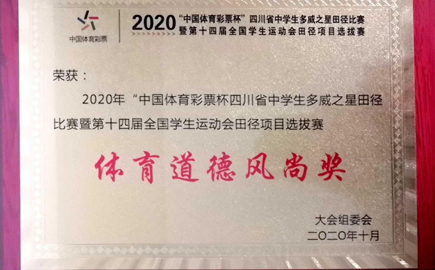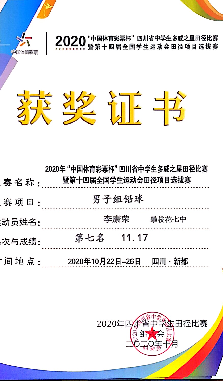 2020年10月24日至26日我校12名运动员参加在成都市新都一中举行的四川省中学生田径比赛,全省84所中学参与激烈争夺。我校学生叶新获男子组跳远第一名(6.90米)三级跳远第二名(14.24米)并获优秀运动员奖。李康荣获男子组铅球第七名(11.17米),毛其获女子组铅球第六名(10.61米)。我校获体育道德风尚奖。