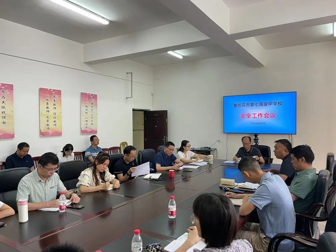 2024年4月30日上午市七中在花城校区3号楼2楼会议室召开了安全工作会,对学校近期安全工作进行了安排部署,会议由学校党委书记杨鸿主持,班子成员和科室负责人参加。