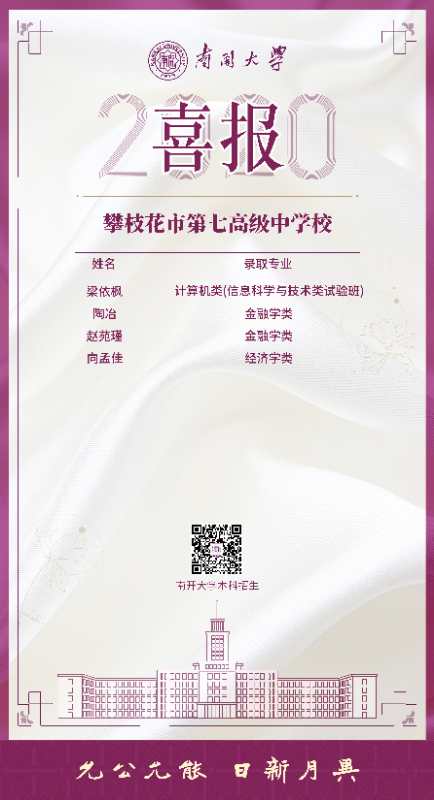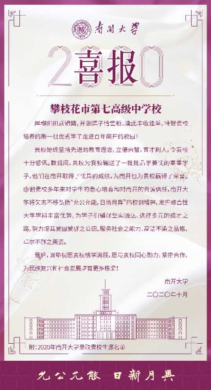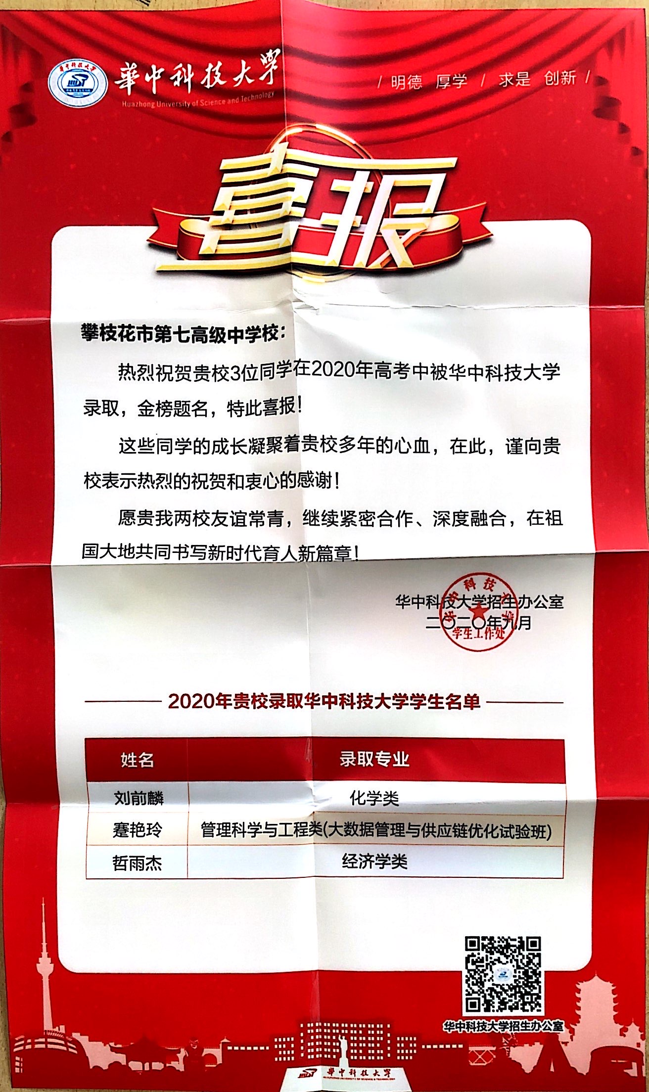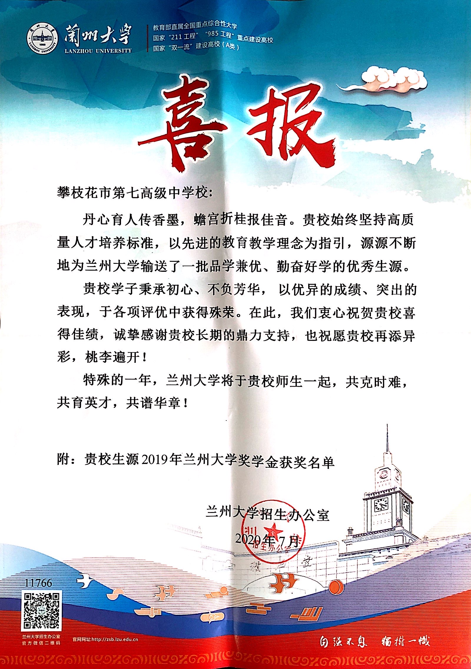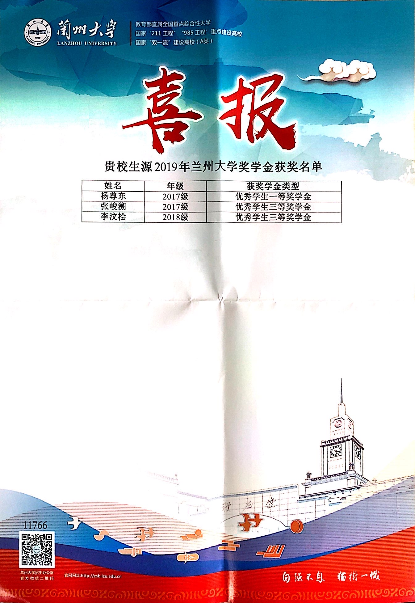 近日,我校相继收到“985”“211”“双一流”著名高校兰州大学、华中科技大学、南开大学发来的喜报。兰州大学喜报表扬我校毕业学生杨尊东、张峻溯、李汶桧大学期间学习刻苦努力,成绩优异,综合表现突出,分别获得2019年“优秀学生一等奖学金”、“优秀学生三等奖学金”、“优秀学生三等奖学金”。华中科技大学喜报祝贺我校2020届学生刘前麟、蹇艳玲、哲雨杰被华中科技大学录取。南开大学喜报祝贺我校2020届学生梁依枫、陶冶、赵苑瑾、向孟佳被南开大学录取。