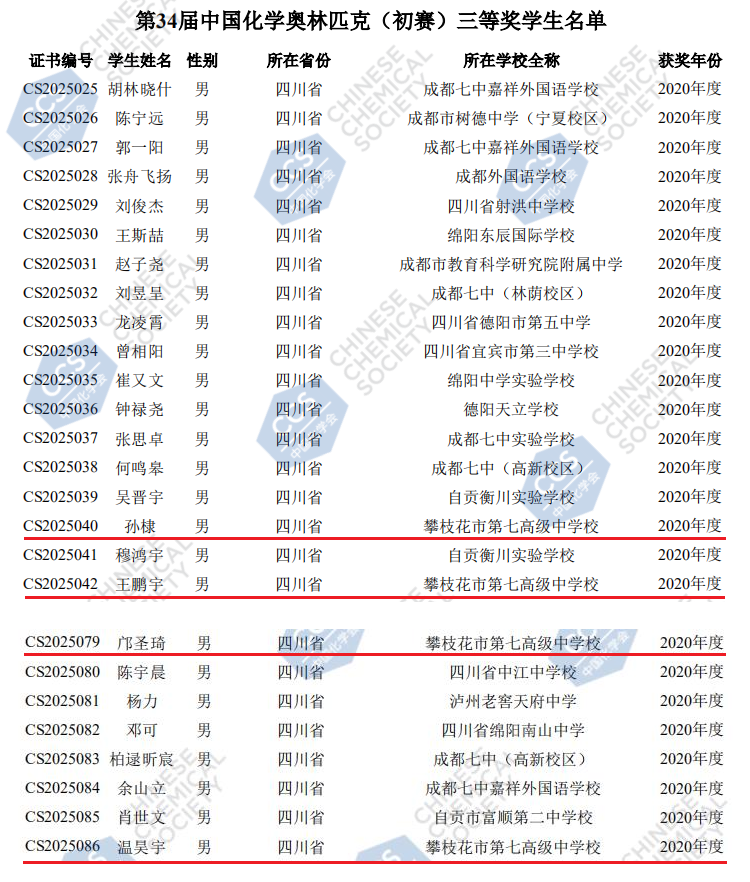 近日,2020年第34届中国化学奥林匹克(初赛)获奖名单公布,我校高2021届选派的孙棣、王鹏宇、邝圣琦、温昊宇等4名参赛队员全部获得全国三等奖,取得历史性突破!