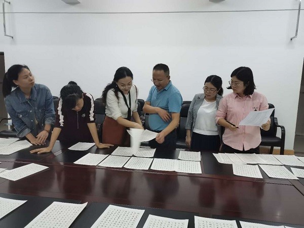 现场大赛特邀攀枝花市第七高级中学校副校长、攀枝花市教师教学技能三笔字三级检测员谢子明作为评委会组长,高2023届语文教研组部分骨干教师作为评委会成员对全部参赛作品进行评选。