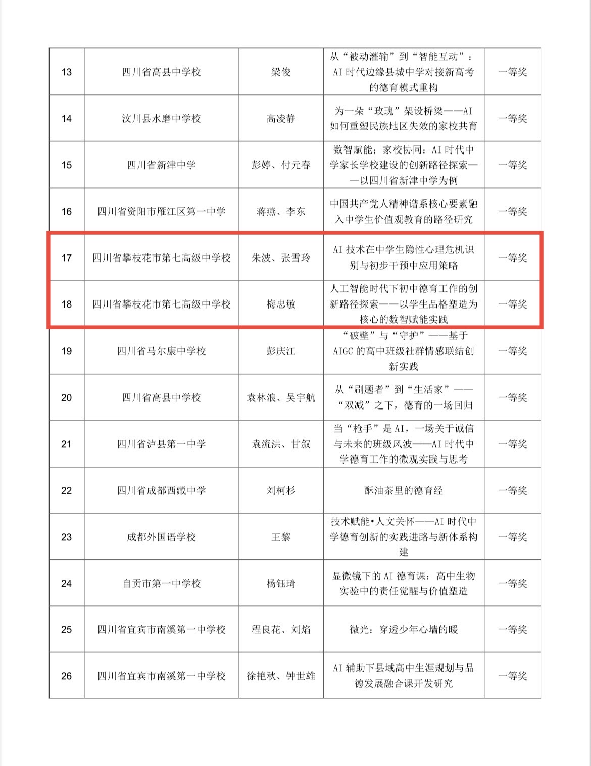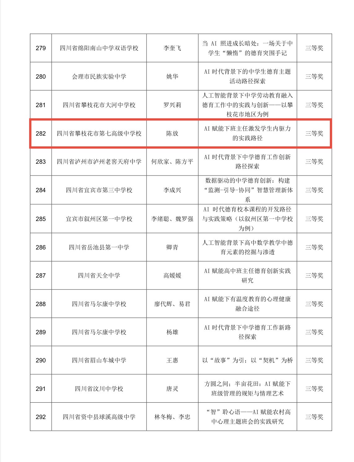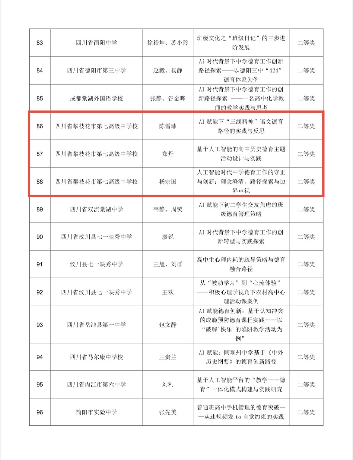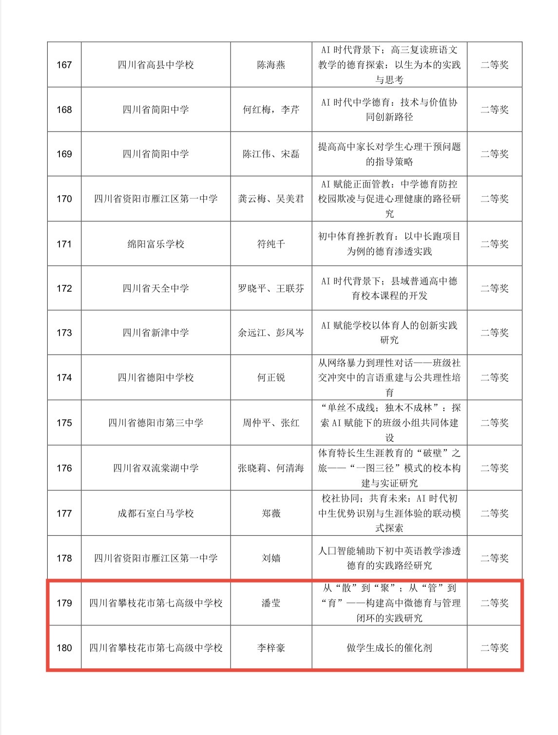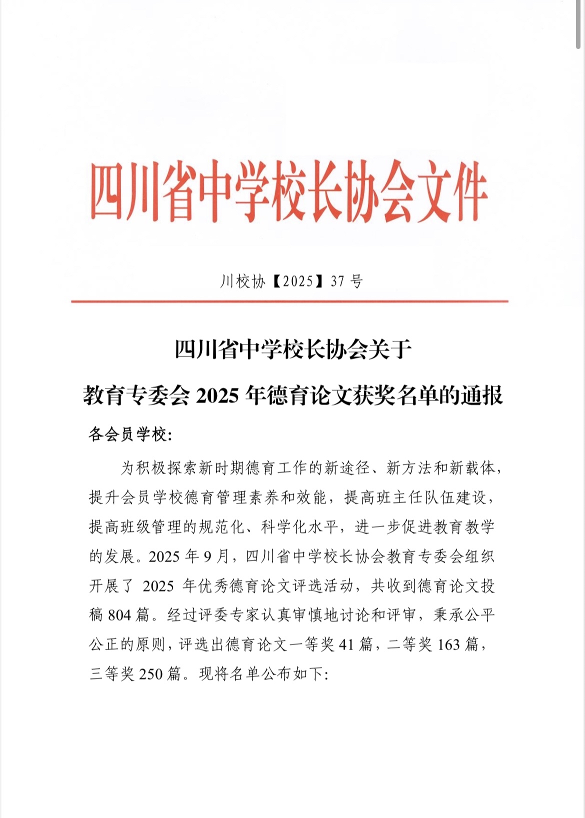 近日,四川省中学校长协会教育专委会颁布了2025 年德育论文获奖名单,攀枝花市第七高级中学校的教师们所撰写的论文荣获多个奖项,创下佳绩。