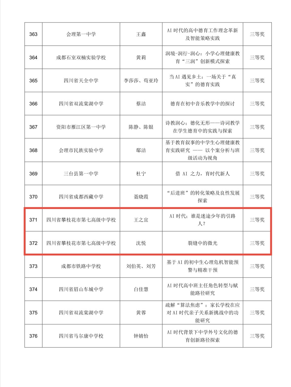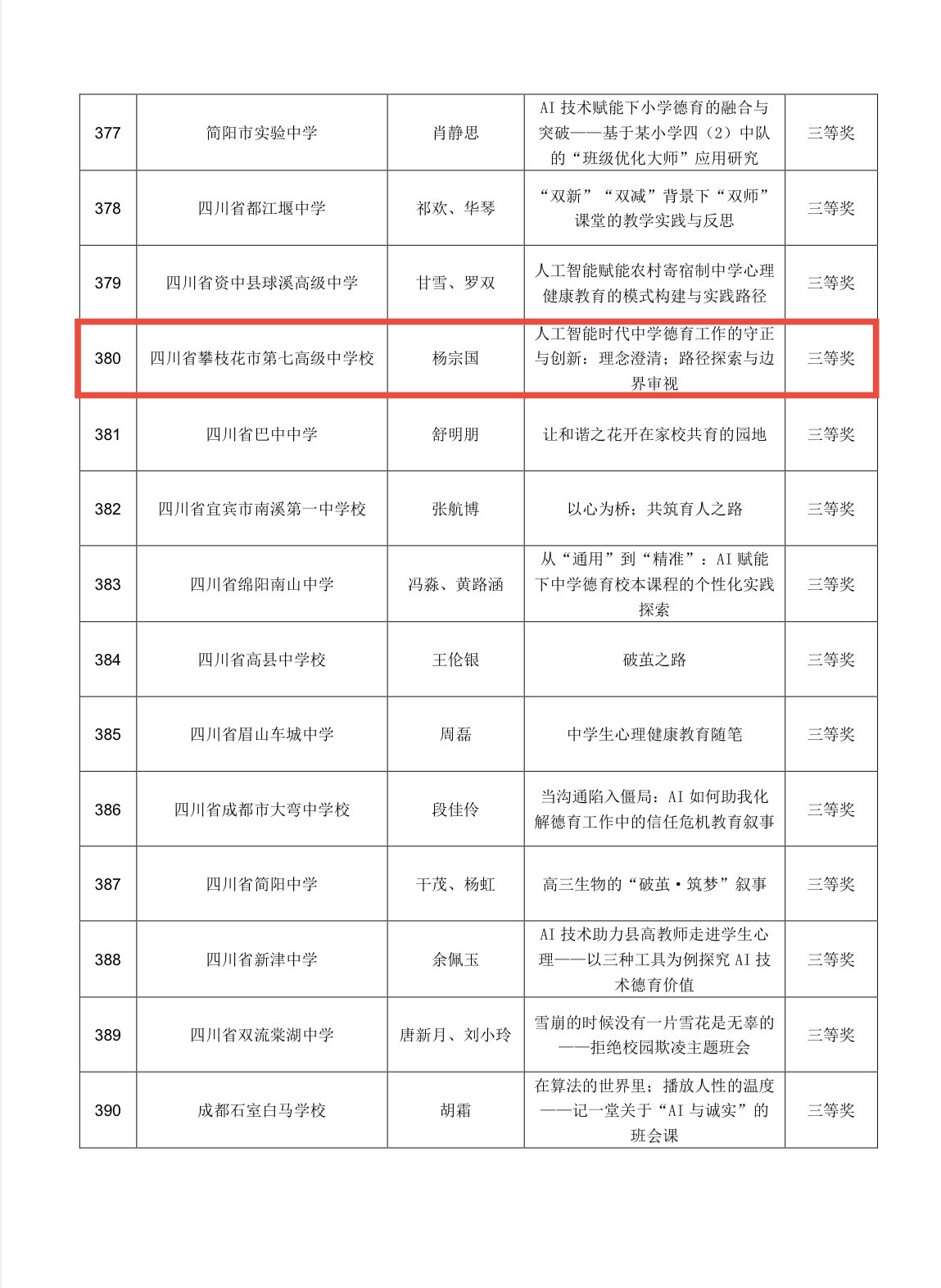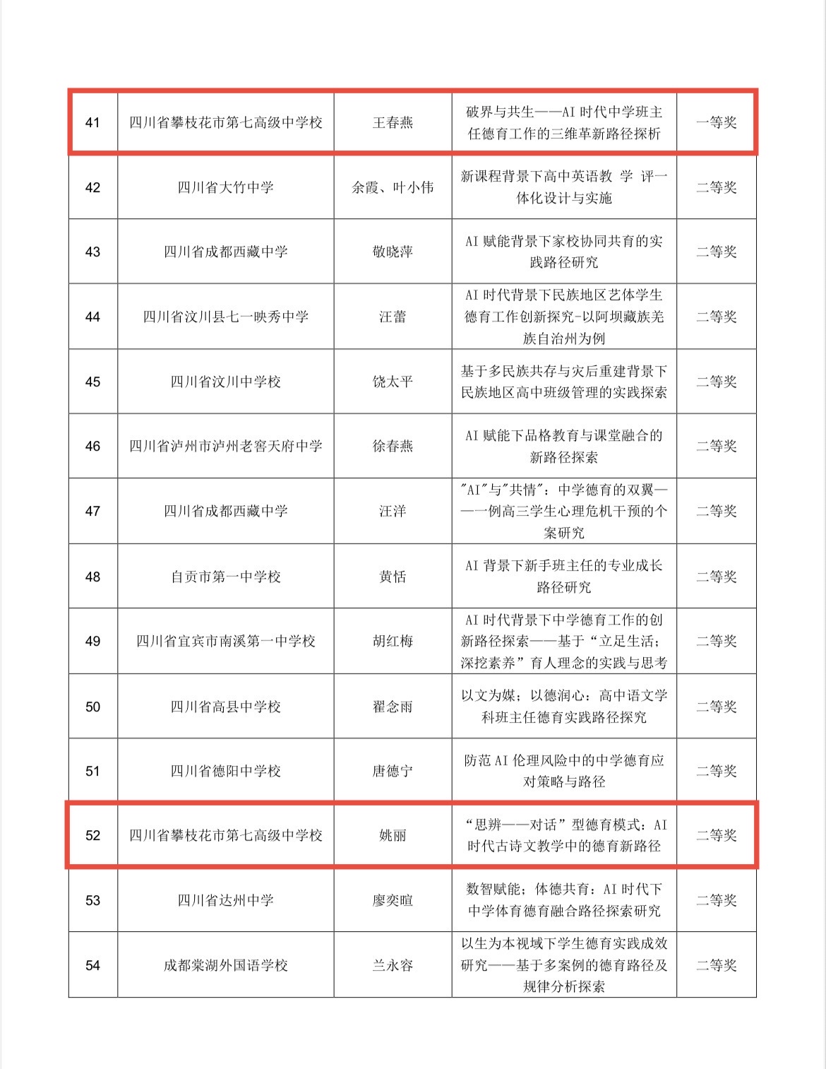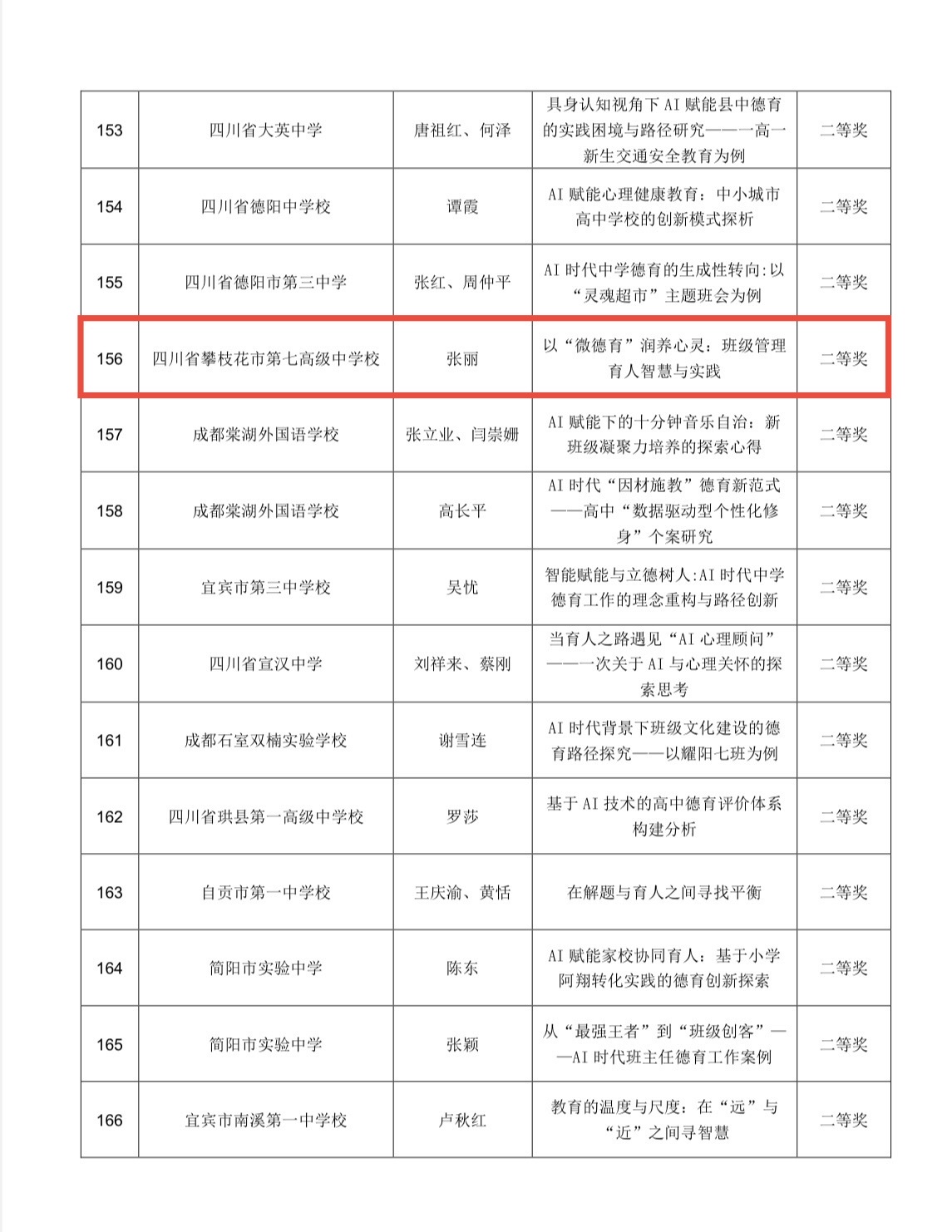 近日,四川省中学校长协会教育专委会颁布了2025 年德育论文获奖名单,攀枝花市第七高级中学校的教师们所撰写的论文荣获多个奖项,创下佳绩。