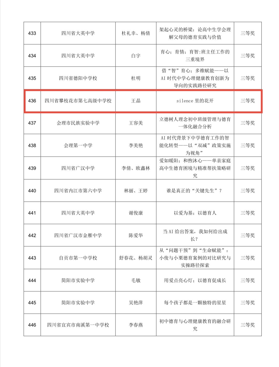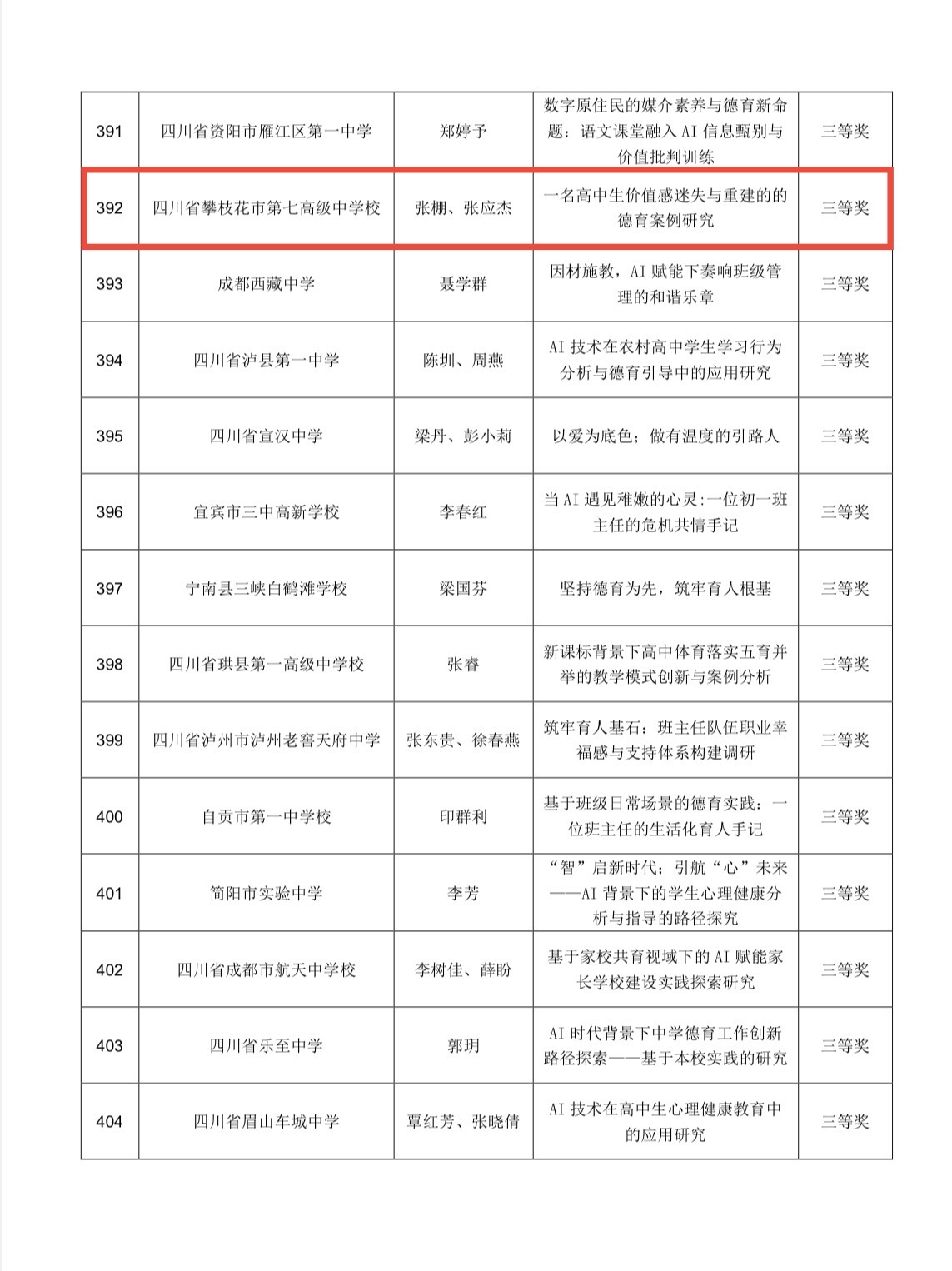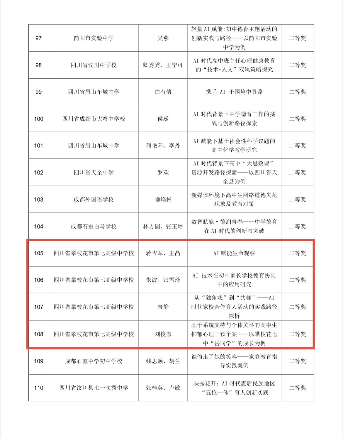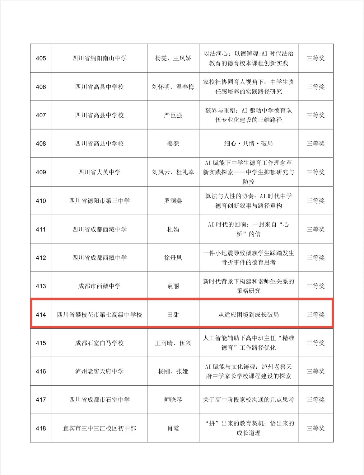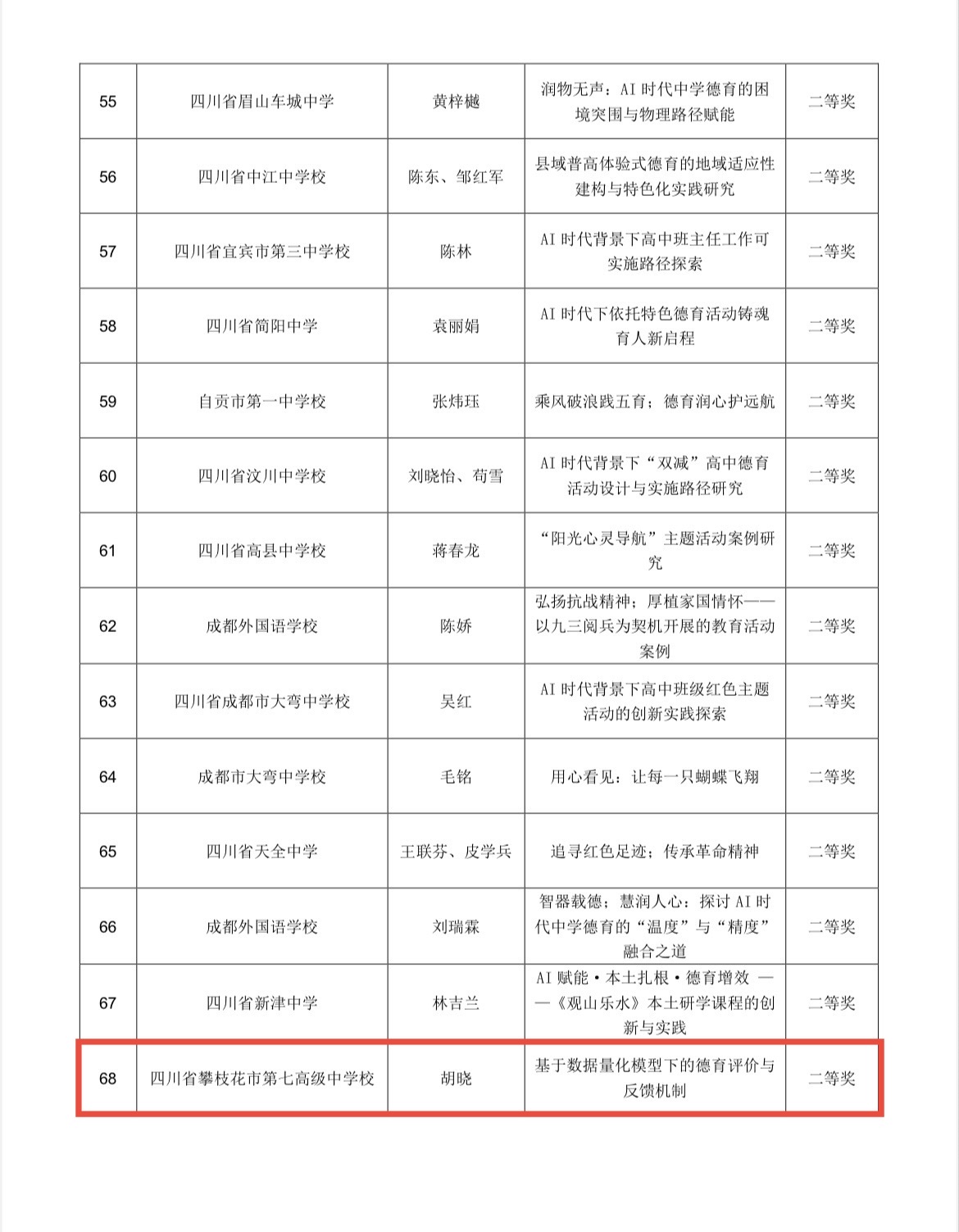 近日,四川省中学校长协会教育专委会颁布了2025 年德育论文获奖名单,攀枝花市第七高级中学校的教师们所撰写的论文荣获多个奖项,创下佳绩。