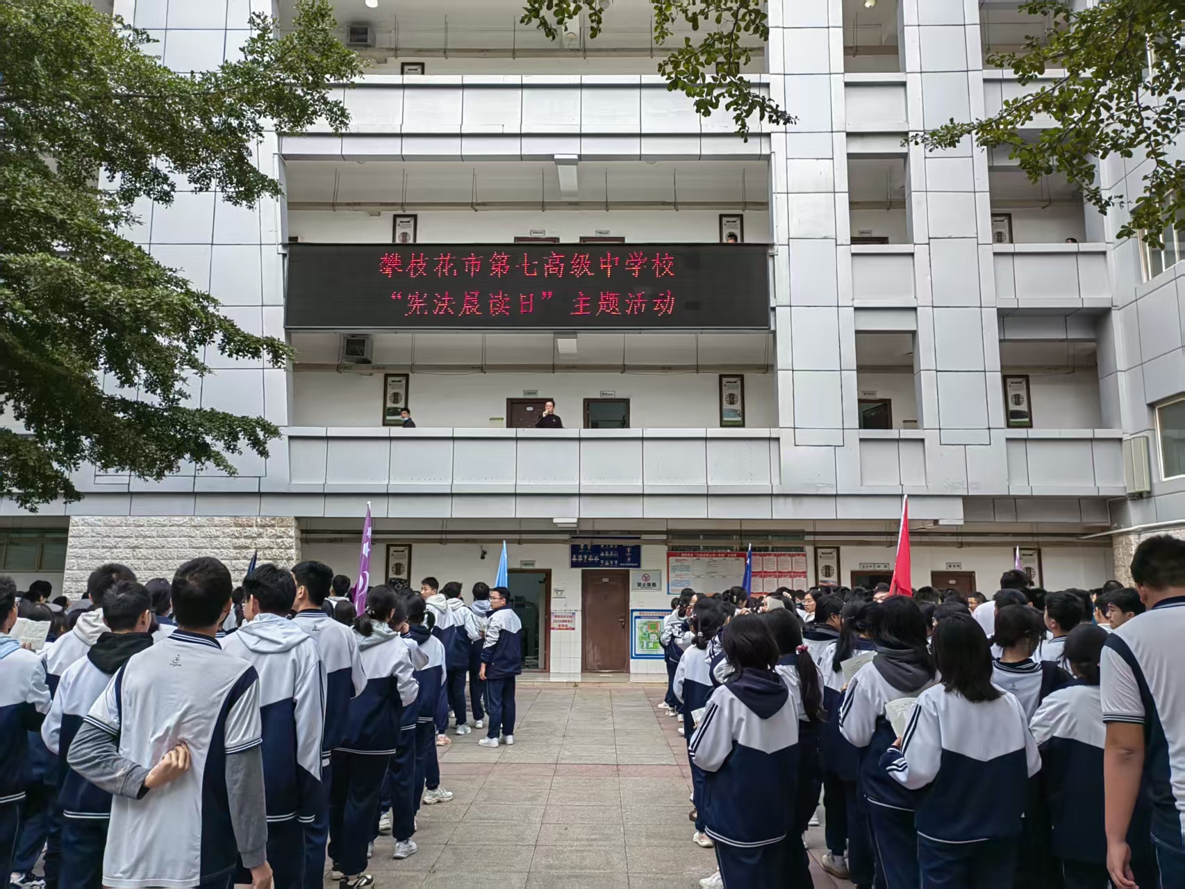 为深入学习贯彻法治思想,迎接第十二个“国家宪法日”,进一步在青少年中普及宪法知识、弘扬宪法精神、树立宪法权威,2025年12月3日上午,攀枝花市第七高级中学校精心组织全校师生,同步开展了一场庄重而热烈的“宪法晨读,声入人心”主题教育活动。活动采取“主会场引领、分会场响应、班级全覆盖”的联动模式,在校园内营造出尊崇宪法、学习宪法、遵守宪法、维护宪法、运用宪法的浓厚氛围。