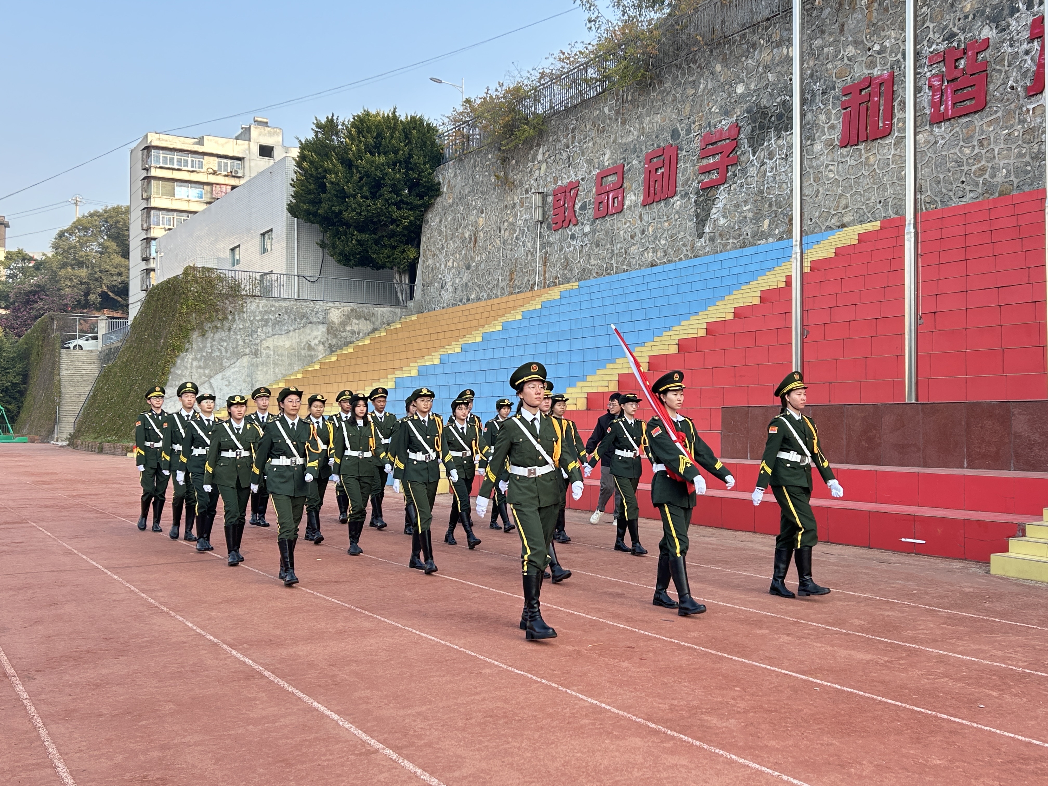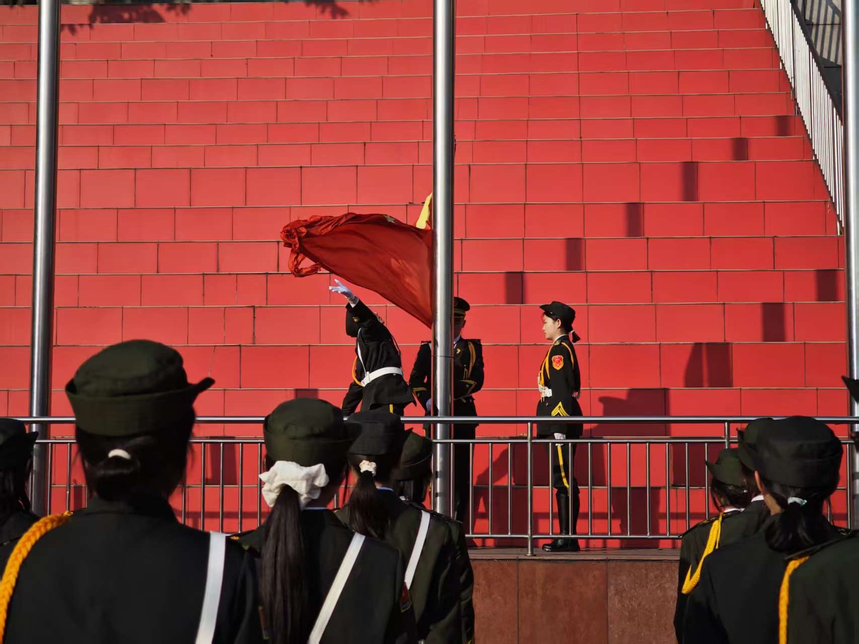 随着国旗的冉冉升起,学生们在操场上整齐列队,齐声高唱国歌。