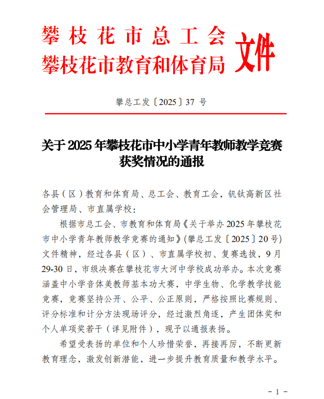 据悉,本次竞赛由攀枝花市总工会与市教育和体育局联合举办,全程严格遵循公开、公平、公正原则,通过层层选拔与现场竞技,最终评选出优秀团体与个人。两位老师的载誉而归,不仅是个人潜心钻研和不懈奋进的体现,更是学校深耕教师专业发展、推进课堂教学改革的丰硕成果。