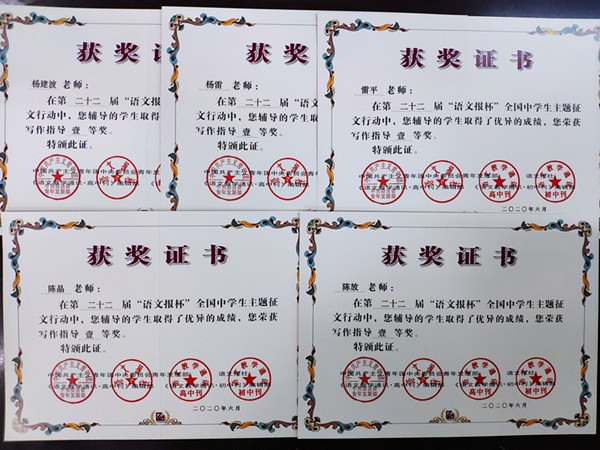 日前,第二十二届“语文报杯”全国中学生作文大赛成绩揭晓,我校高2022届师生共16人在比赛中获奖。其中陈晶、陈放、杨雷、雷平、杨建波等五位老师获得写作指导一等奖;李珍珍、田一伶二位同学获得省级一等奖;谢欣儒、谢煜婷、殷周铭三名同学获得省二等奖;毛舒美、袁意钧、蒲奕辰、杨雨嫣、胥露月、蒋雯萱六名同学获得省级三等奖。