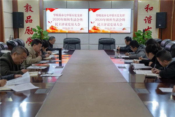 2021年1月15日上午,攀枝花市七中第五党支部在西城校区博通楼四楼多功能会议室召开2020年度组织生活会暨民主评议党员大会,全体党员到会,学校党委书记汪建明以普通党员参会,会议由支部书记何文刚主持。