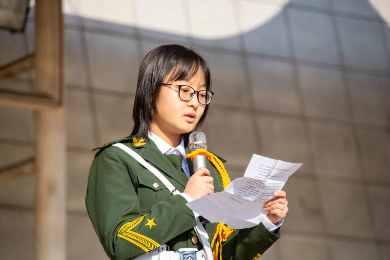 花城校区高一(4)班李沁钢同学用真挚饱满的情感进行《校园安全,你我共享共建》为主题的国旗下讲话,呼吁全体师生,加强学校的安全教育和管理,人人树立安全意识,杜绝安全事故的发生,撑起一片安全的天空,共建安全校园!西城校区高二27班杜星蓉同学讲话的题目则是《与安全同行,让美好绽放》,分别从疫情防控安全、食品安全、交通安全、校内消防安全、校内建筑安全、遇险自救互救应急安全和保持心理健康七个方面向全体师生发出“与安全同行,让美好绽放”的倡议。
