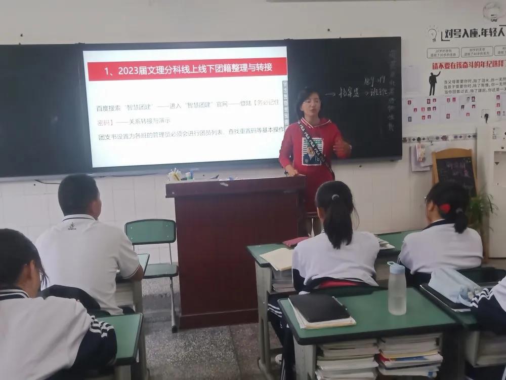 随后彭老师对近期团费收缴、团员发展、文理分科后团籍档案整理与转接等重点团务工作进行了安排部署,并利用慧道一体机对“智慧团建”系统和“志愿四川”系统进行了同屏操作演示,就近期家长和同学反馈的问题进行了答疑解惑。