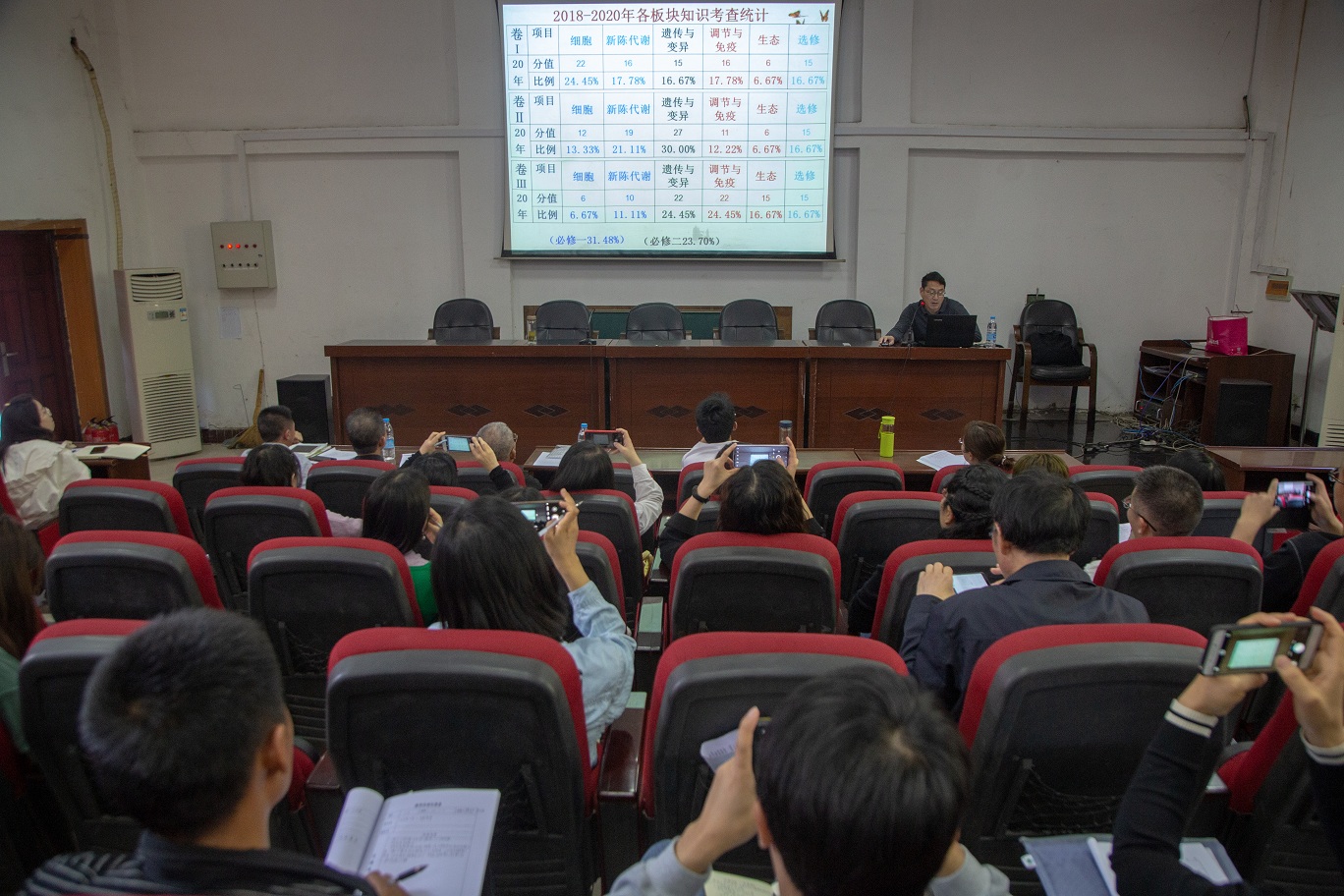第二个环节由市三中天府名师、特级教师方志林老师作了《2021年高三生物第二轮复习方法及应考策略》的专题讲座。在专题讲座中,方老师提出了大家在二轮复习中遇到的困惑,分别以“研究考纲变化、近三年高考生物试题考查特点分析、2021年高考二轮备考计划与复习策略”三个方面进行了详细的解读。方老师根据高考命题的逻辑和特点指出,教材是根本,在复习过程要多读教材、深挖教材、注重教材信息;同时也要加强实验设计、语言文字表达能力的训练。高考生物考题层出不穷,千变万化,但都离不开生物基础知识的考查,要努力做到以基础知识为支撑点,以能力为再生点,以思维训练为落脚点,以不变应万变,充分掌握高考主动权。