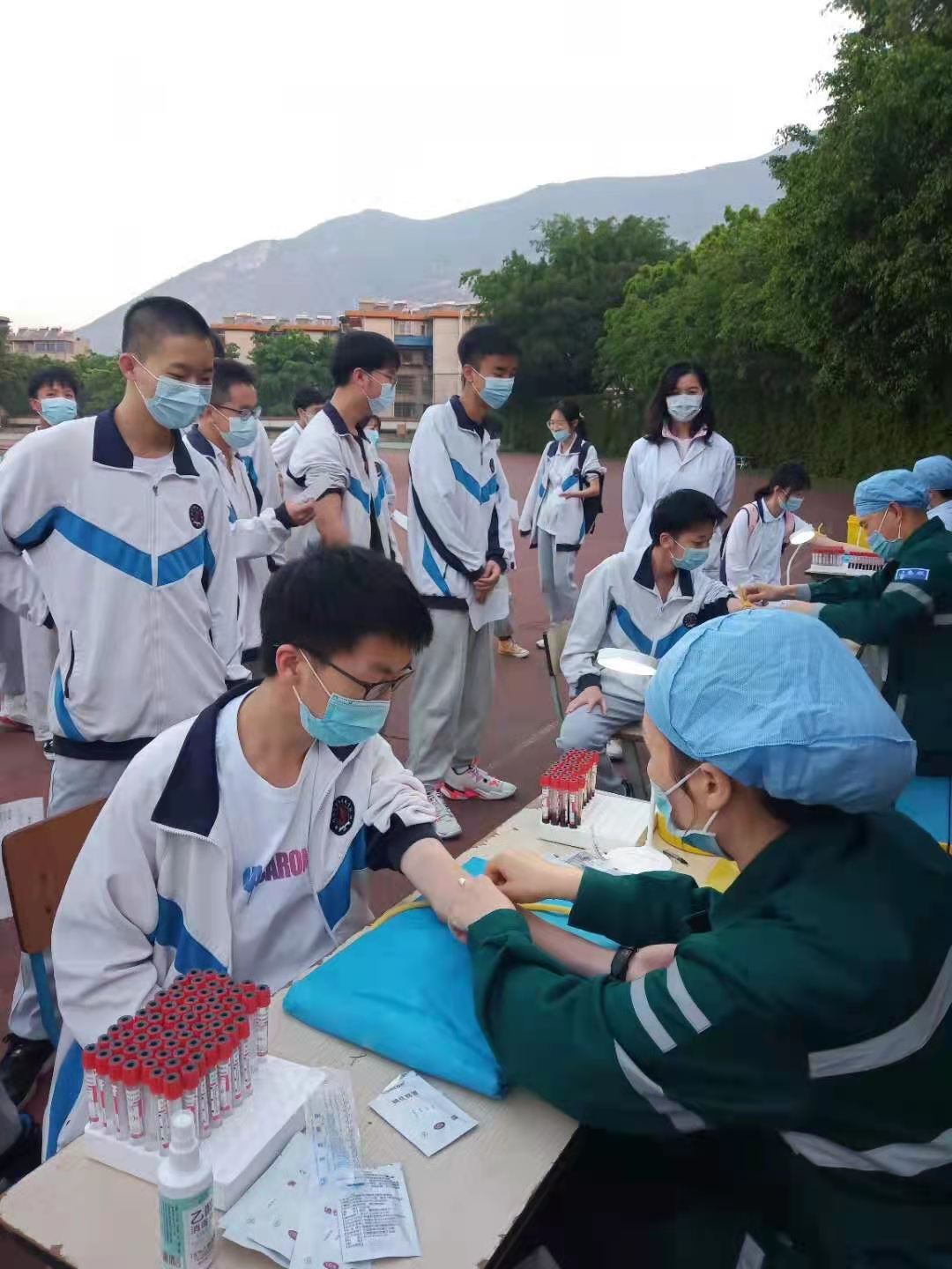 早上6:50,等候体检的学生,在高三年级主任赵均勇和总务和安全科副科长漆功俐,及校医和相关班级班主任老师的指引下,依次排队进入操场指定的地点,有序接受采血。采血过程中,学生们积极配合医生,自觉遵守体检秩序,全程流畅、安静;全体医务人员工作认真细致、操作严谨规范、态度亲切随和,为每一位学生提供了严格、安全、标准的体检服务。许多学生在排队等候体检的间隙时间,拿出自己的笔记本、复习资料,边排队边学习,他们学习上争分夺秒的精神充分体现了七中学子自动自发、自强不息的风貌。