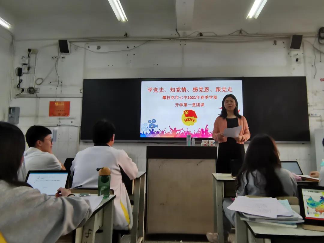 为热烈庆祝中国共产党成立100周年,引导广大青年学生领悟红色精神,传承红色基因,落实团中央关于“全团抓学校”的重要部署,根据《关于开展四川学校共青团2021年春季学期“开学第一堂团课”的通知》文件精神,攀枝花市七中团委积极组织各班团支部开展了以“学党史、知党情、感党恩、跟党走”为主题的“开学第一堂团课”主题活动。